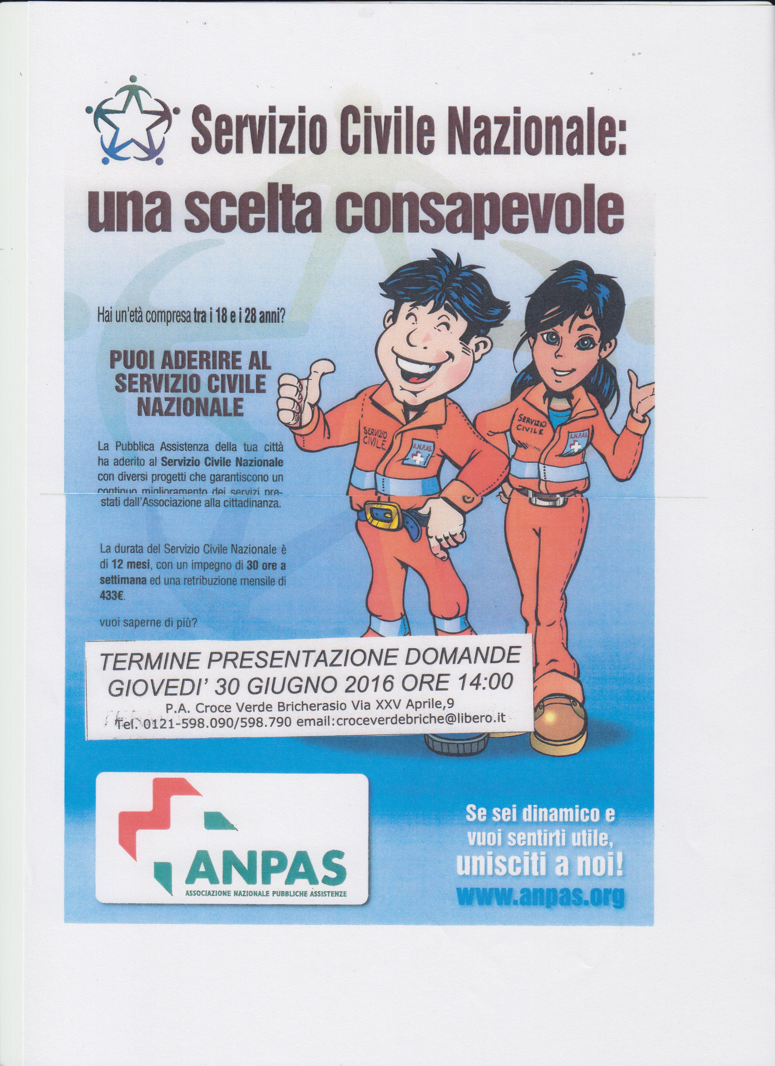 La Croce Verde di Bricherasio aderisce ai Bandi 2016 del Dipartimento della Gioventù e del Servizio Civile Nazionale, delle Regioni e Province autonome, per la selezione di volontari da impiegare in progetti di Servizi ordinari. Destinatari sono i giovani (senza distinzione di sesso) che abbiano compiuto 18 anni e non superato i 28 al momento della presentazione della domanda e che siano cittadini italiani o degli altri Paesi dell’Unione europea o cittadini non comunitari regolarmente soggiornanti. Non costituisce causa ostativa alla presentazione della domanda di servizio civile nazionale l’aver già svolto il servizio civile nell’ambito del programma europeo “Garanzia Giovani” o aver interrotto il servizio civile nazionale a conclusione di un procedimento sanzionatorio a carico dell’ente originato da segnalazione dei volontari. Il servizio dura 12 mesi non rinnovabili, può essere svolto una sola volta nella vita, e i Volontari che parteciperanno al Progetto riceveranno direttamente dall’Ufficio Nazionale per il Servizio Civile 433,80€ mensili. Gli interessati possono rivolgersi alla sede della Croce Verde in Via XXV Aprile n. 9 a Bricherasio o scaricare dal sito www.anpas.piemonte.it i moduli per la presentazione della domanda (allegati 2 e 3), compilarli e consegnarli all’associazione comunque entro e non oltre le ore 14.00 del 30 giugno. I progetti che verranno attivati presso la Croce Verde di Bricherasio sono due: - "Pronto 118": per il servizio di emergenza-urgenza territoriale 118 (3 posti disponibili) e "Un trasporto per te" per il servizio di accompagnamento pazienti (altri 3 posti disponibili). Maggiori informazioni al numero 0121/598090.