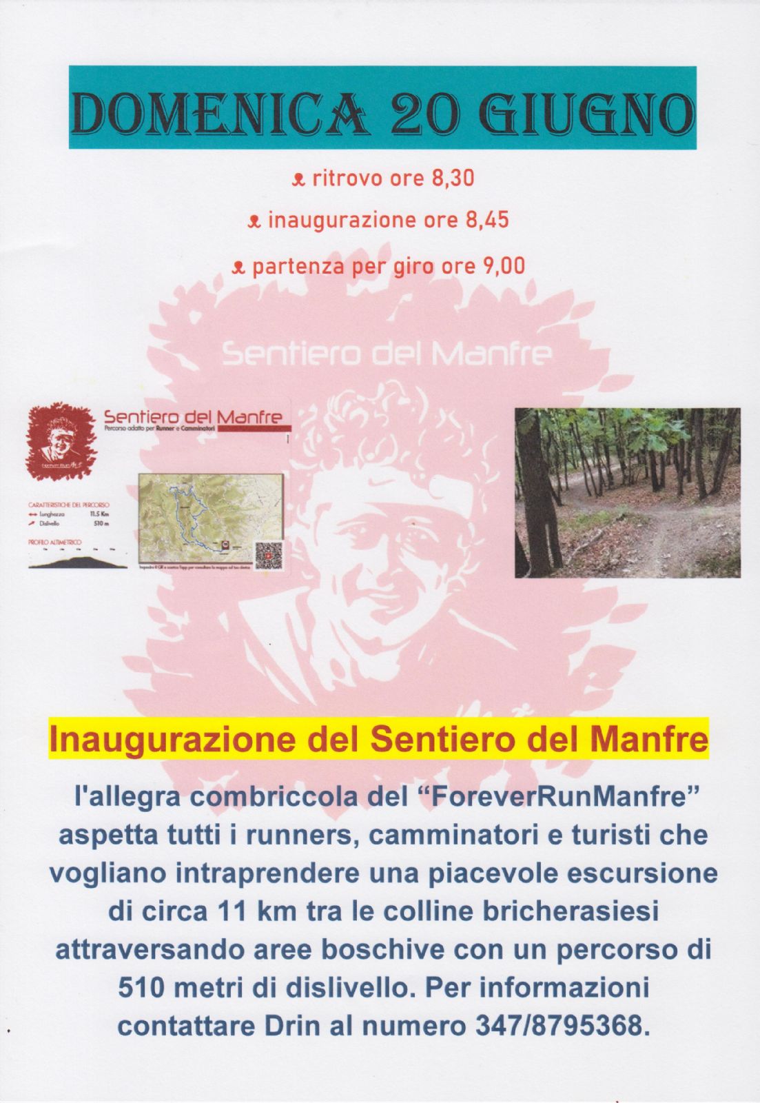 Domenica 20 giugno, con ritrovo fissato alle ore 8.30 in frazione S.Michele, è previsto un momento inaugurale alle ore 8,45 con successiva partenza per un giro dell'anello alle ore 9.00. L'allegra combriccola granata aspetta tutti i runners, camminatori e turisti che vogliano intraprendere una piacevole escursione di circa 11 km tra le colline bricherasiesi che attraversa perlopiù aree boschive con un percorso di 510 metri di dislivello, quasi indipendente dagli altri sentieri già segnalati in zona. L'indicazione planimetrica e la traccia gpx sarà segnalata sul sito web dell'Atletica Val Pellice e su quello ufficiale del Comune di Bricherasio. Per maggiori informazioni contattare Drin Caffaratti al numero 347/8795368.
