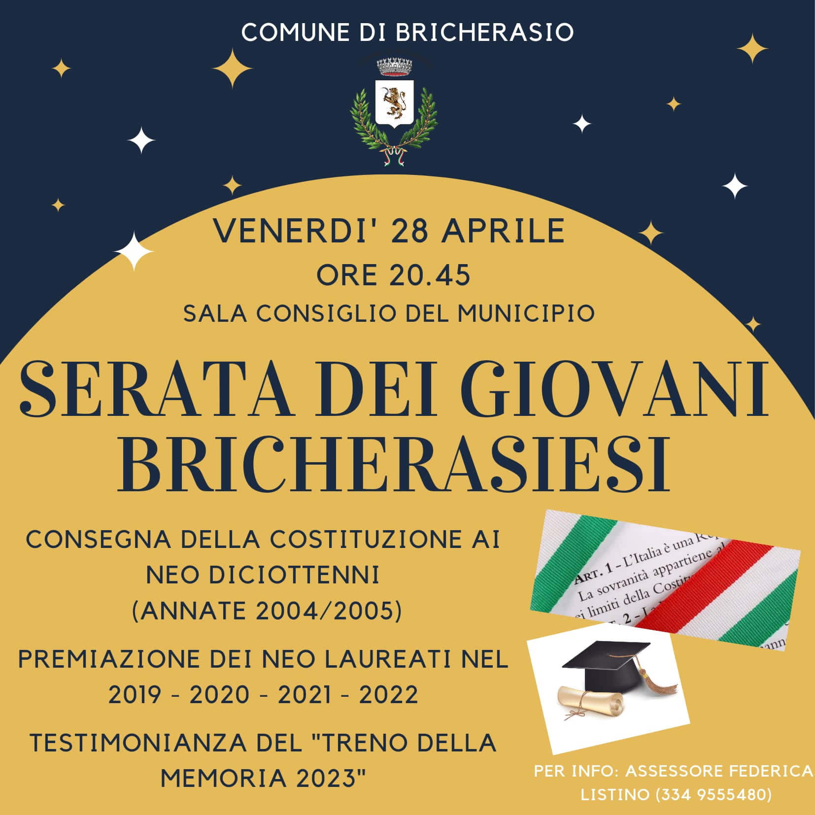 Venerdì 28 aprile alle ore 20,45 in Municipio serata dei giovani bricherasiesi con consegna della Costituzione ai neo diciotenni (anni 2004/2005), premiazione dei laureati dal 2019 al 2022 e testimonianza dei partecipanti al Treno della memoria del 2023