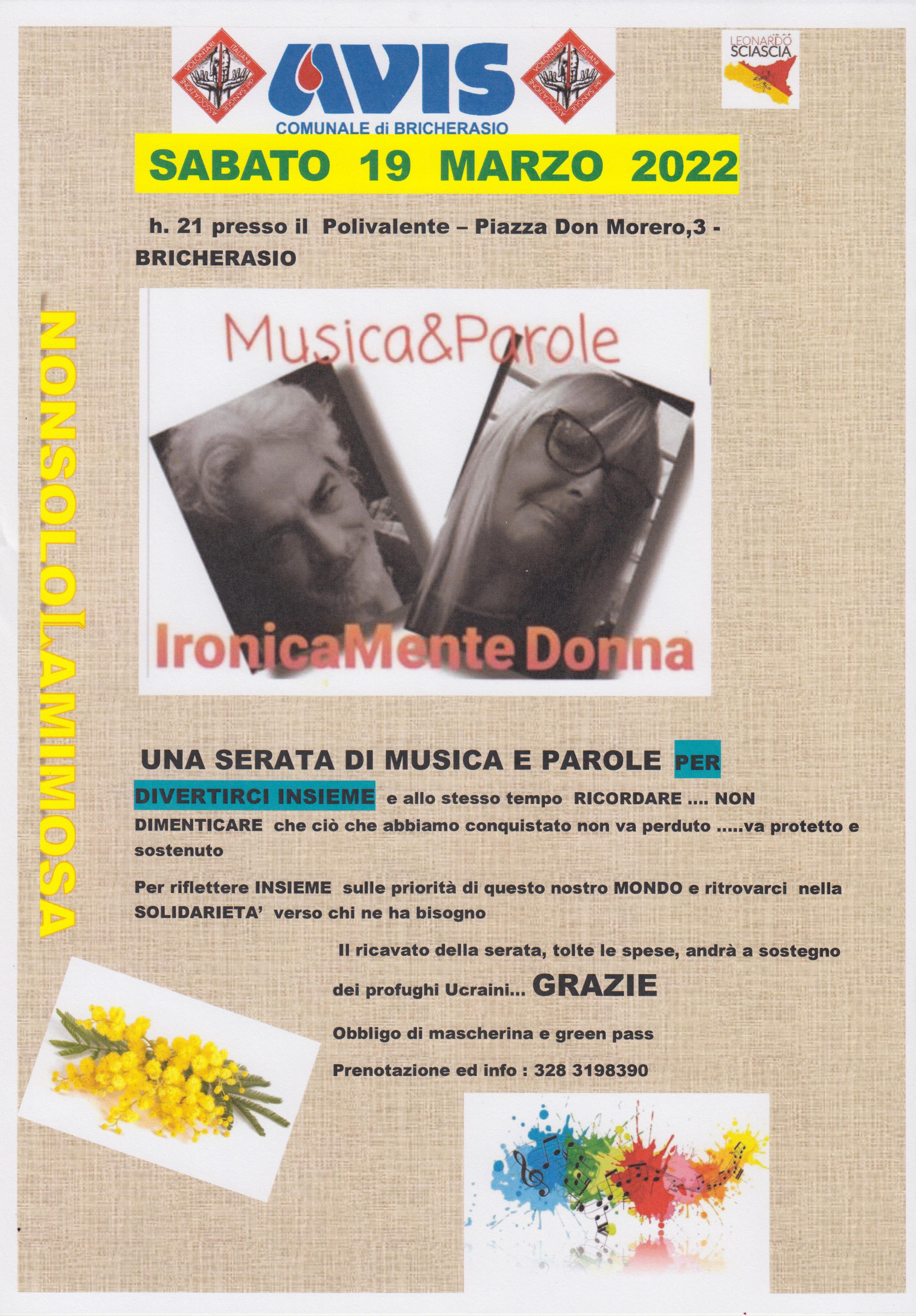 L’Associazione Leonardo Sciascia di Bricherasio, da sempre vicina alle persone più deboli, a chi attraversa un periodo di difficoltà o semplicemente un momento di bisogno anche in occasione della mobilitazione a livello nazionale a favore dei profughi ucraini mette in moto le proprie conoscenze e parte una raccolta fondi a loro favore. Sabato 19 marzo alle ore 21 nel Salone Polivalente di Piazza Don Morero 4, a Bricherasio con la collaborazione dell’Avis locale viene proposta la serata di musica e parole “IronicaMente Donna” per far divertire tutti assieme ed allo stesso tempo ricordare e non dimenticare perchè ciò che si è conquistato nn deve essere perso ma protetto e sostenuto. Per riflettere sulle priorità del nostro mondo e ritrovarsi nella solidarietà verso chi ne ha bisogno il ricavato della serata, al netto delle spese, sarà devoluto per sostenere i profughi ucraini. L’ingresso è consentito ai possessori di green pass muniti di mascherina. Sin dalla sua nascita molto attenta al lato sociale, la Sciascia in undici anni grazie alla sua Presidente, Lilly Di Martino, vulcano di idee ed iniziative promosse nel corso dell’ultimo decennio si è ritagliata uno spazio importante nel paese. Le sue proposte hanno sempre riscosso successo ad iniziare dalla collaborazione con il paese di Amatrice dopo il terremoto per proseguire con le coperte della solidarietà a favore dell’Esercito della Salvezza e la raccolta di materiale a favore dei bambini afghani di agosto quando il cortile dell'abitazione era invaso da ogni ben di Dio di prodotti per igiene e pulizia, giochi, vestiti, scarpe e tutto l'occorrente per la crescita. Si può anche donare utilizzando l'iban dell'Associazione culturale Leonardo Sciascia IT40G0306926554100000001306 e tutto sarà visibile e documentato perché i soldi finiscono a chi ne ha realmente bisogno e, come accade sempre, l'associazione Sciascia non organizza le manifestazioni e gli eventi culturali per esibizionismo ma mettendoci il cuore e l’umanità. Per informazioni e prenotazioni telefonare al Presidente dell’Avis di Bricherasio, Michele Savalli, al numero 327/3198390.