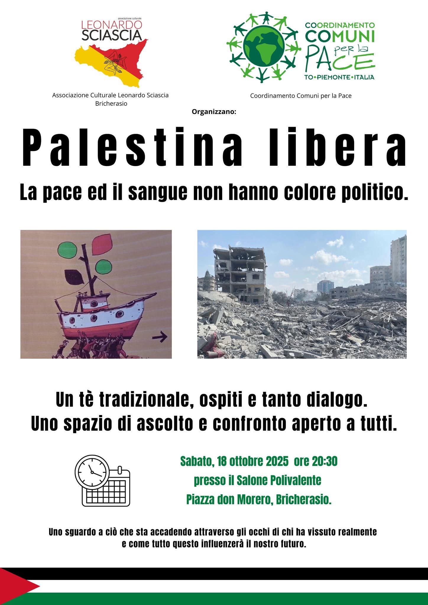 L'Associazione Culturale Leonardo Sciascia di Bricherasio promuove per sabato 18 ottobre alle ore 20,30 al Salone Polivalente di Piazza Don Morero, 2 a Bricherasio una serata dedicata alla Palestina. La serata intende promuovere la consapevolezza come strumento per contrastare i soprusi e le violenze attraverso la sensibilizzazione e l'informazione, mirando a trasmettere nuovi stimoli di crescita e riflessione grazie al dialogo tra pubblico e relatori.