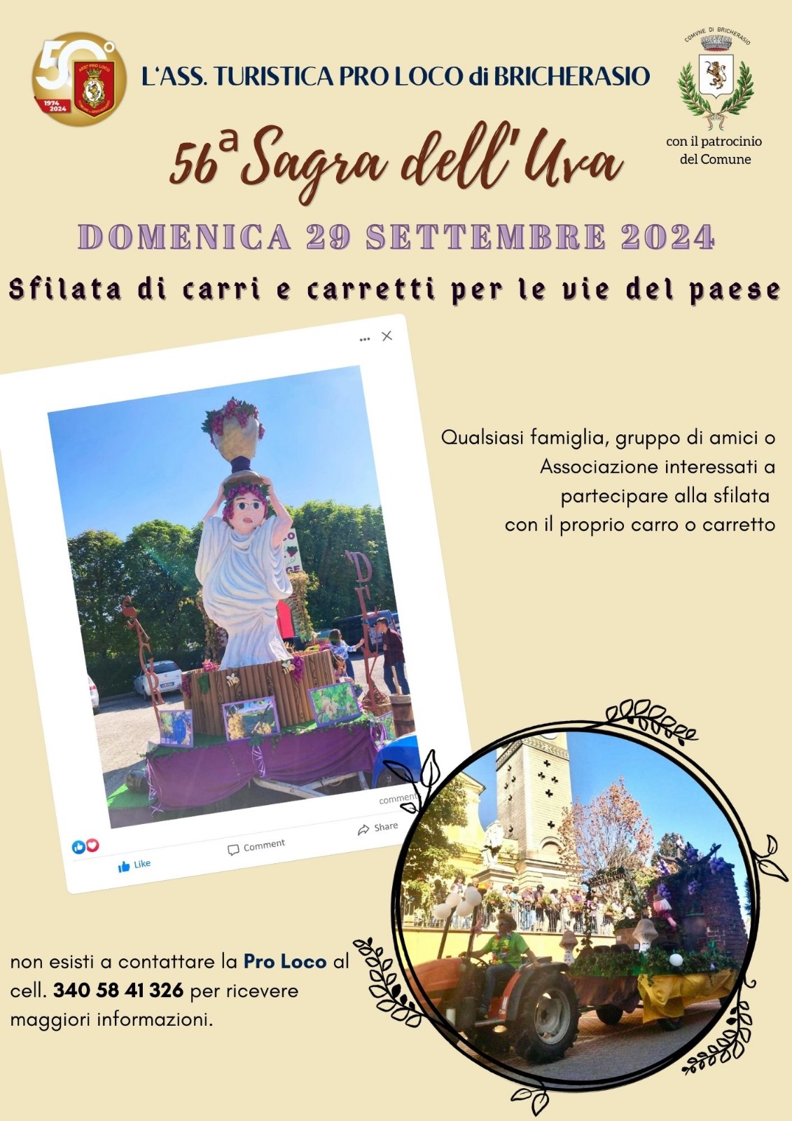 Nel pomeriggio di domenica 29 settembre, con inizio alle ore 14.15, si svolgerà la sfilata dei carri allegorici e dei carretti con le maschere cittadine e le grazielle, accompagnati dalla Filarmonica San Bernardino e dall’Associazione Danza Sportiva Panda di Bricherasio. Qualsiasi famiglia, gruppo di amici od associazione interessata a partecipare contatti la Pro Loco al n.340.5841326,