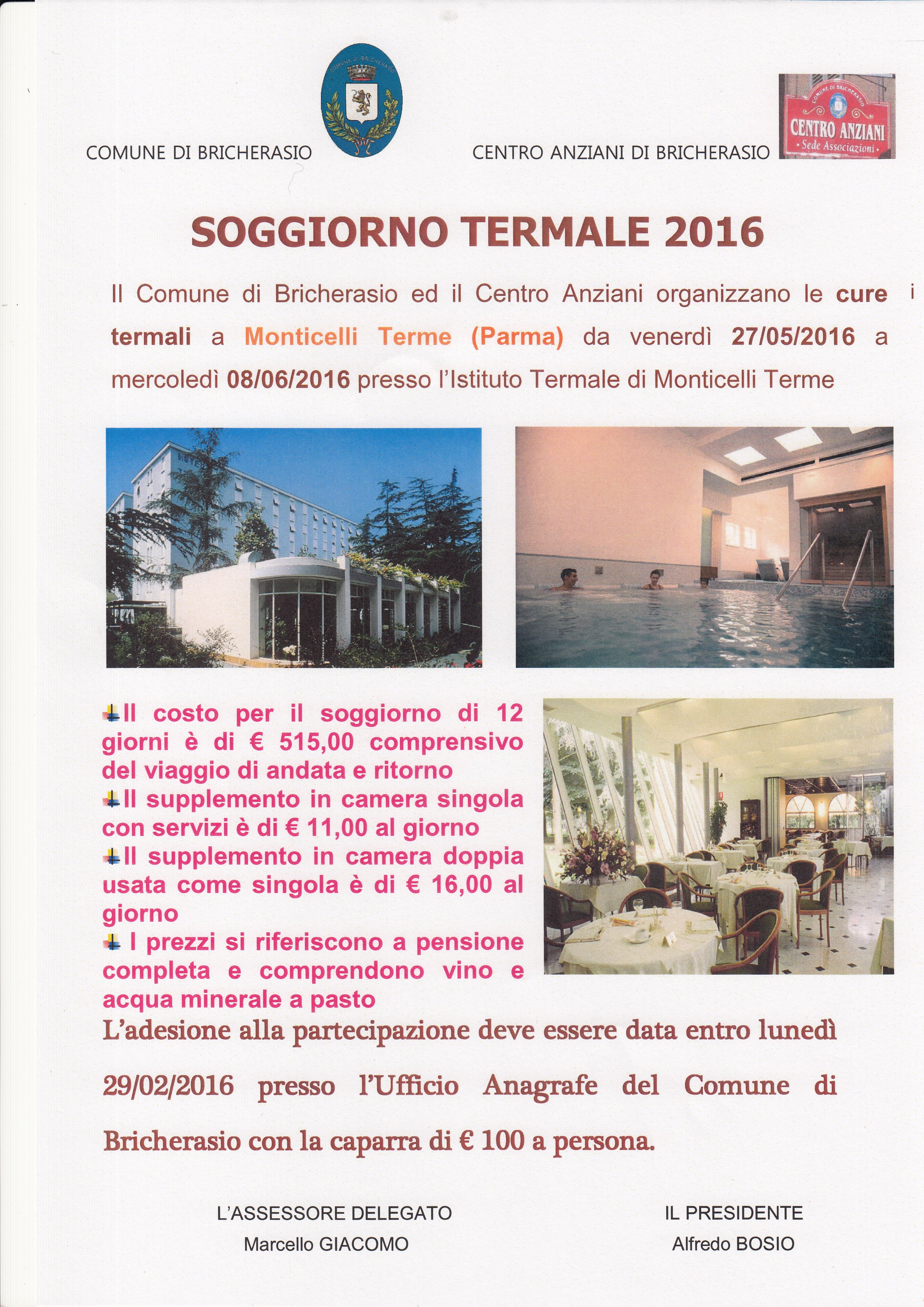 Il Comune, in collaborazione con il Centro Anziani, organizza il soggiorno di cure termali a Monticelli Terme, in provincia di Parma, da venerdì 27 maggio a mercoledì 8 giugno. Il costo per il soggiorno di 12 giorni ed il viaggio è di 515,00 €. Il supplemento in camera singola con servizi è di 11,00 € al giorno, quello per la sistemazione in camera doppia usata come singola 16 € giornalieri. I prezzi si riferiscono a pensione completa comprensivi di acqua minerale o vino.