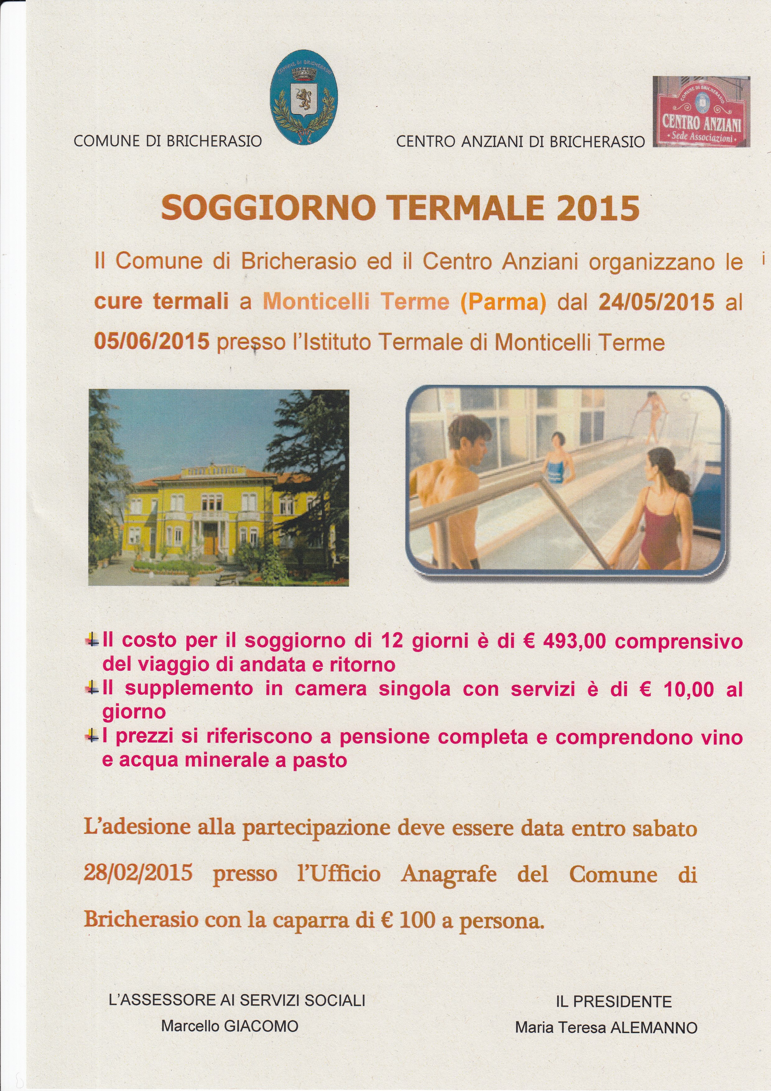 Sono aperte presso il Comune di Bricherasio le iscrizioni per le cure termali a Monticelli Terme, in provincia di Parma, organizzate dal Comune in collaborazione con il Centro Anziani da Domenica 24 maggio a venerdì 5 giugno 2015 presso l’Istituto Termale di Monticelli Terme. Il costo per un soggiorno di 12 giorni, con il viaggio, è di 493,00 €. Il supplemento in camera singola con servizi è di 10,00 € al giorno. I prezzi si riferiscono a pensione completa comprensivi di acqua minerale o vino a pasto. L’adesione alla partecipazione và data entro sabato 28 febbraio all’Ufficio Anagrafe del Comune di Bricherasio versando la caparra di 100,00 € a persona.