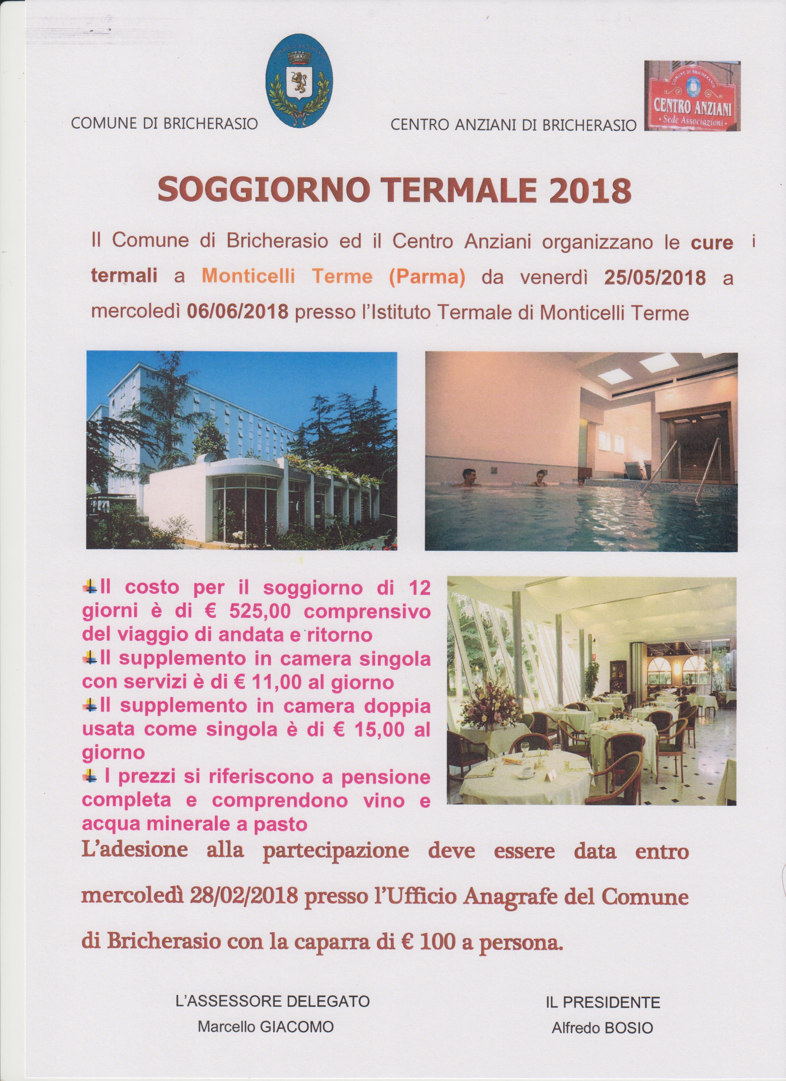 Ritorna anche nel 2018 l'appuntamento con il soggiorno per le cure termali a Monticelli Terme, in provincia di Parma, organizzate dal Comune in collaborazione con il Centro Anziani da venerdì 25 maggio a mercoledì 6 giugno. Il costo per un soggiorno di 12 giorni, con il viaggio, è di 525,00 €. Il supplemento in camera singola con servizi è di 11,00 € al giorno, quello per la sistemazione in camera doppia usata come singola 15 € giornalieri. I prezzi si riferiscono a pensione completa comprensivi di acqua minerale o vino a pasto.