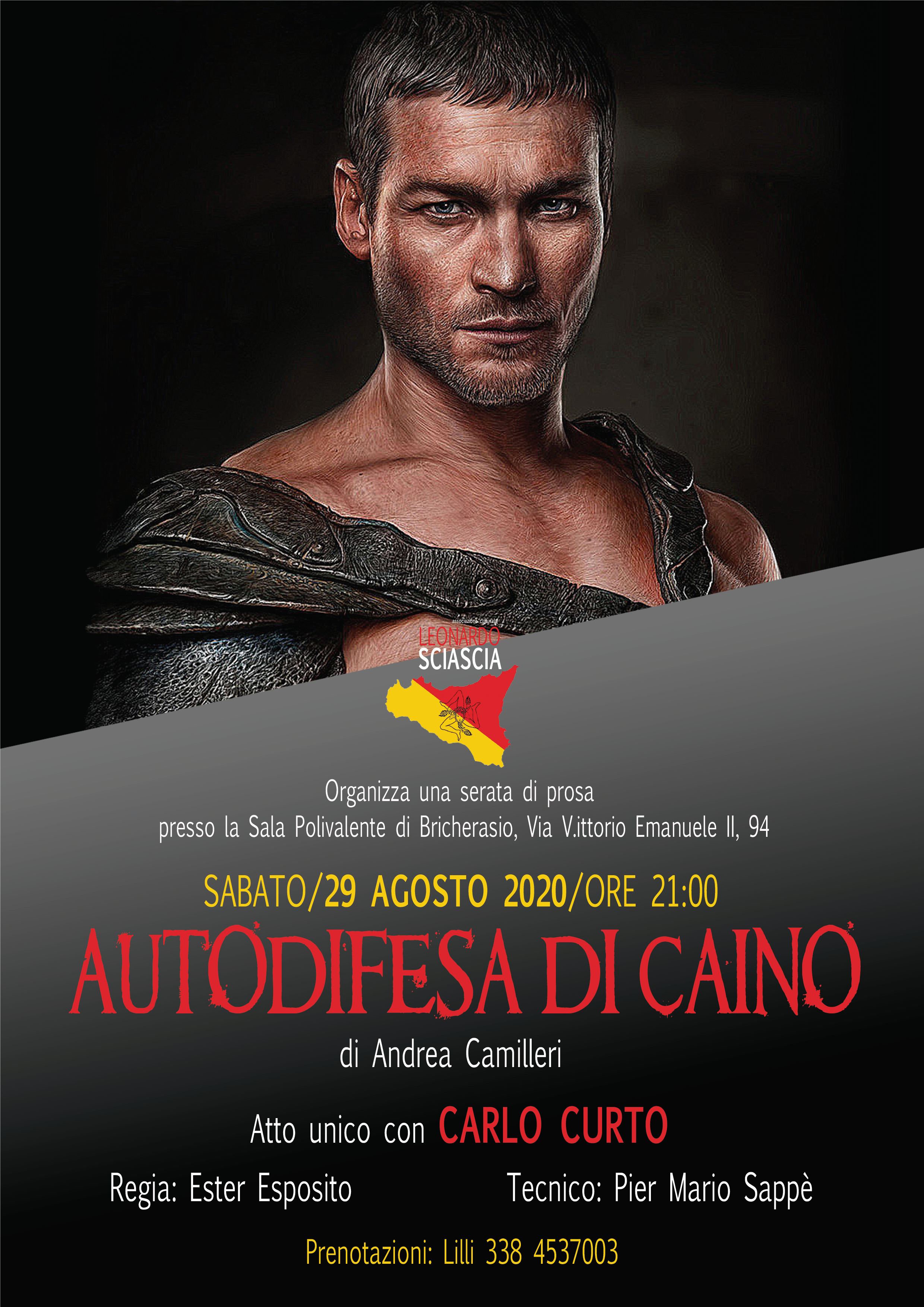 L’Associazione Culturale “Leonardo Sciascia” di Bricherasio" col patrocinio del Comune di Bricherasio invita tutti a partecipare allo spettacolo di prosa previsto per le ore 21 di sabato 29 agosto al salone Polivalente di Bricherasio: "Autodifesa di Caino" del grande maestro Andrea Camilleri, un atto unico con Carlo Curto e la regia di Ester Esposito. Lilly Di Martino, la Presidente dell'associazione culturale L.Sciascia, al riguardo dice: “Andrea Camilleri se ne è andato il 17 luglio 2019, ci ha lasciato il suo scritto su Caino che aveva completato e per il quale aveva immaginato tutto: la scena e gli intermezzi musicali, i filmati da proiettare sullo schermo, i testi da interpretare di persona e quelli da far recitare. Si tratta di un testo potente, profondo che risponde alle incessanti domande sul bene e il male e affonda le sue radici nella sterminata cultura di Camilleri, nella sua sensibilità letteraria, artistica, musicale, nella sua passione per il mito”. Prosegue con una riflessione “Il genio di Camilleri ci sorprende ancora una volta e ci ricorda la grandezza di questo scrittore per la letteratura italiana. Camilleri non è solo Montalbano ma è Teatro, Cinema e, soprattutto, Arte di Raccontare”. Ingresso ad offerta libera per massimo 75 persone munite di mascherina. Prenotazioni dei posti disponibili al numero 338/4537003.