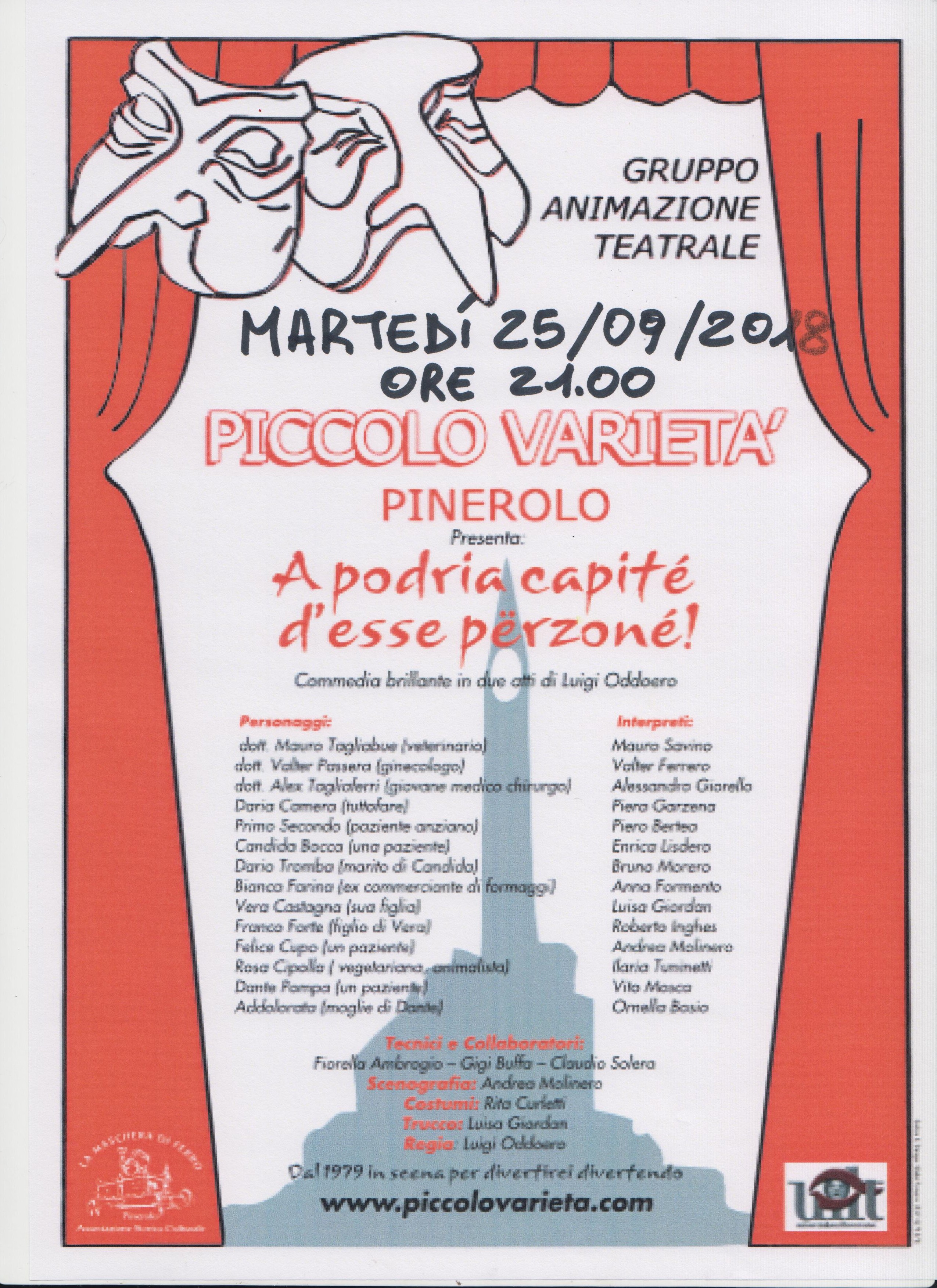 La Pro Loco di Bricherasio organizza all’interno della 50^ Sagra dell’Uva bricherasiese un appuntamento con il teatro brillante dialettale piemontese della Compagnia Piccolo Varietà di Pinerolo. Lo spettacolo è organizzato per martedì 25 settembre alle ore 21 al Salone Polivalente di Piazza Don Morero. La compagnia presenta la commedia in due atti intrisi di equivoci e travolgente comicità “A podria capitè d'esse perzonè”, di Luigi Oddoero. E’ la classica commedia che si svolge nella sala d'attesa di un centro medico specialistico "Medicalnatura" nel quale esercitano un ginecologo, il Dottor Passera interpretato da Walter Ferrero, un medico veterinario, dottor Tagliabue impersonato da Mauro Savino e dall'improvvisata impiegata tuttofare Daria Camera interpretata da Piera Garzena. Dunque è da qua che si intrecciano le vicende di varie coppie e di singoli pazienti. La storia principale vede Bianca Farina ex commerciante di formaggi (parte recitata da Anna Formento) alle prese di animate discussioni con la figlia e la nipote. La Compagnia Piccolo Varietà si diverte divertendo. Questa è la parola d'ordine e il segreto di tanti anni di successi in quasi quarant'anni sul palcoscenico a portare in giro tra cabarte e rivista le cadenze della lingua piemontese.