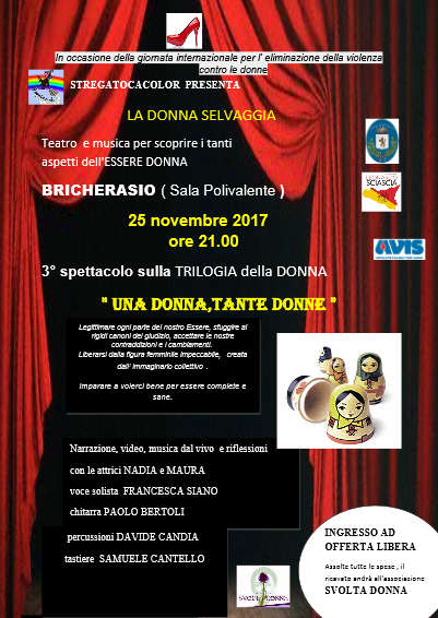 L'Associazione Leonardo Sciascia in collaborazione con Svolta Donna presenta lo spettacolo teatrale "Una donna, tante donne", terzo e ultimo spettacolo della trilogia della donna selvaggia a cura dell'Associazione Stregatocacolor. Teatro e musica per scoprire i tanti aspetti dell'essere donna per legittimare ogni parte del nostro essere, per sfuggire ai canoni del giudizio ed accettare le contraddizioni e i cambiamenti con le attrici Nadia e Maura e la band composta dalla voce solista di Francesca, dalla chitarra di Paolo, dalle percussioni di Davide e dalle tastire di Samuele. Appuntamento alle ore 21 di sabato 25 novembre al Salone Polivalente di Piazza Don Morero. Ingresso ad offerta libera. Per maggiori informazioni tel. 338/2415546.