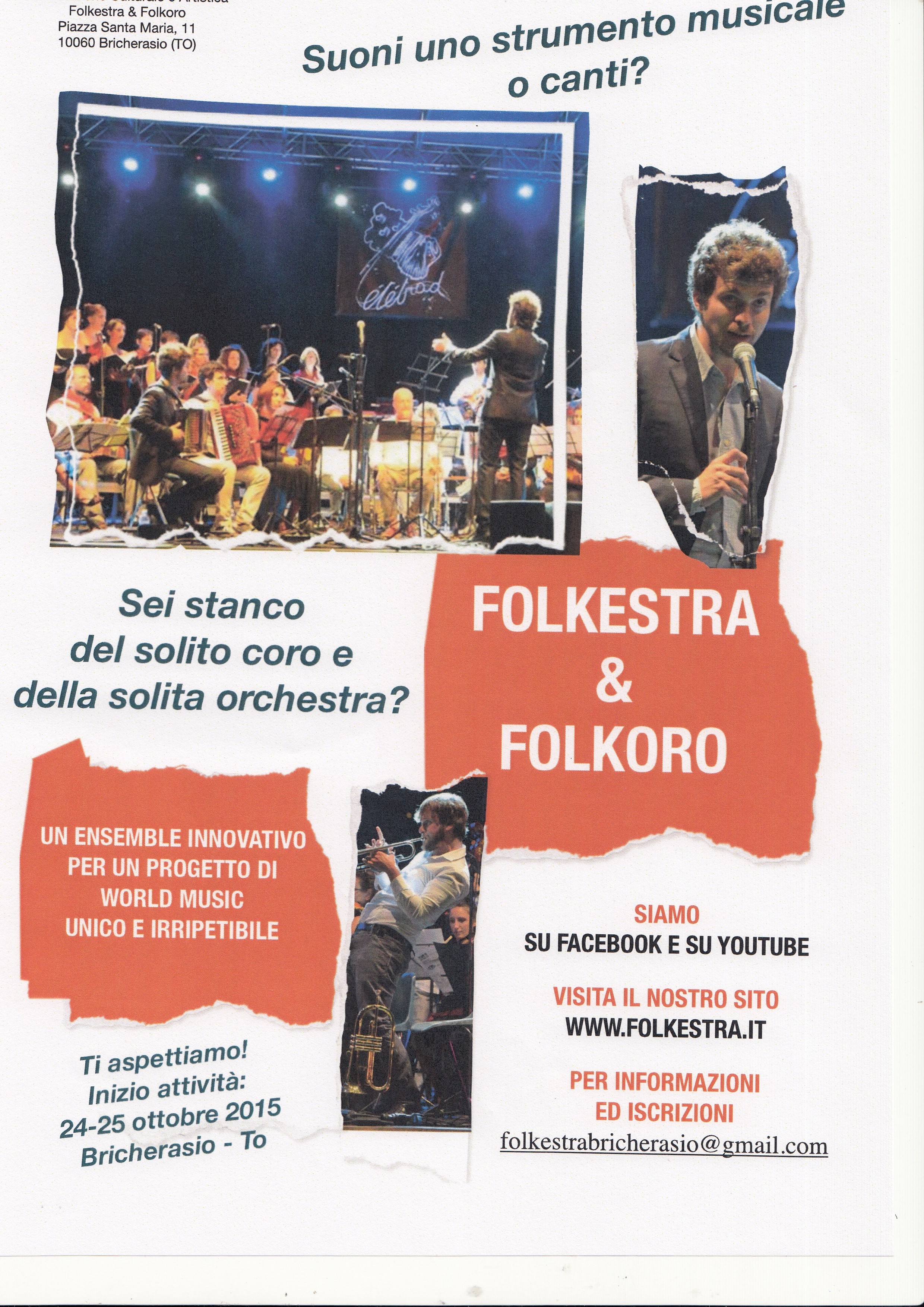Sabato 24 ottobre a partire dalle 21,30 prende il via la stagione 2015/2016 dell’Associazione “Folkestra & Folkoro”. Nel pomeriggio presso il salone polivalente di Bricherasio si tiene il primo incontro tra i componenti dell’ensemble musicale, al quale partecipano i nuovi musicisti e cantanti che entreranno a far parte dell’organico. La sera il polivalente sarà aperto al pubblico per una breve esibizione di “Folkestra & Folkoro” che propone parte del suo consolidato repertorio e successivamente si esibisce sul palco il Duo Bottasso che anima uno scatenato bal folk. I fratelli Bottasso, Nicolò al violino e Simone all’organetto, propongono uno spettacolo di world music con composizioni proprie e reinterpretazioni di brani tradizionali, il tutto unito al desiderio di mantenere in costante evoluzione la tradizione della loro terra di origine. Il duo ha partecipato ad importanti festival tra cui Folkest International Folk festival a Spilimbergo nell’anno in corso e il Printemps des arts a Montecarlo l’anno scorso e nel 2012. I fratelli partcipano attivamente in qualità di direttori e docenti al progetto orchestrale “Folkestra & Folkoro”. L’ingresso alla serata costa 8 euro e per i bambini fino a 12 anni gratuito. Per i soci ARCI 5 euro. Domenica 25 ottobre proseguono per tutta la giornata presso il Centro Pedagogico di Danza e Cultura Popolare di Cascina Marie nella frazione Cappella Merli di Bricherasio, le prove di “Folkestra & Folkoro” in vista della preparazione del nuovo repertorio della stagione. Maggiori informazioni al sito www.folkestra.it o su facebook.