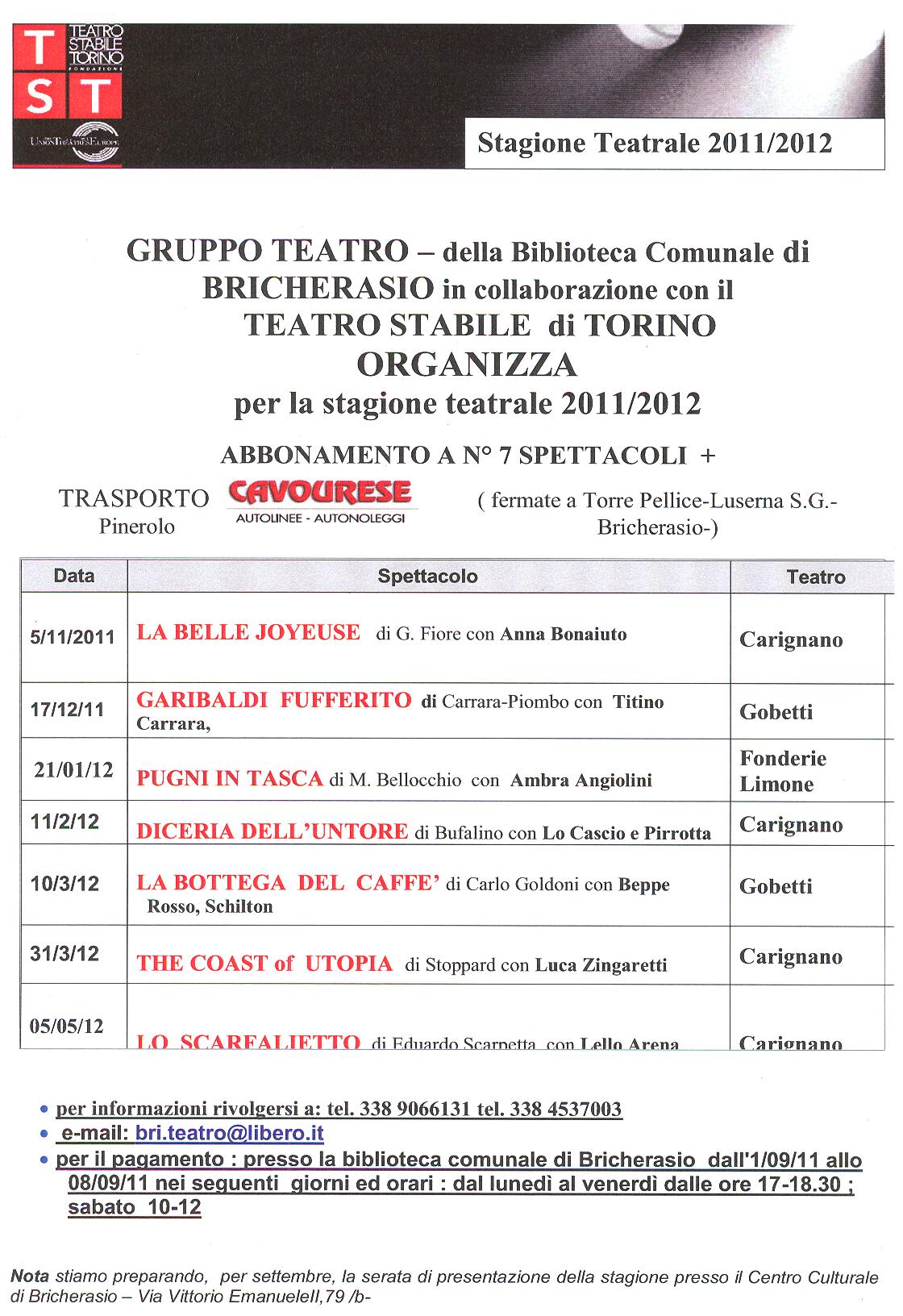 Il Gruppo Teatro della Biblioteca comunale di Bricherasio, in collaborazione con il Teatro Stabile di Torino, organizza per la stagione teatrale 2011-12 un abbonamento a 7 spettacoli