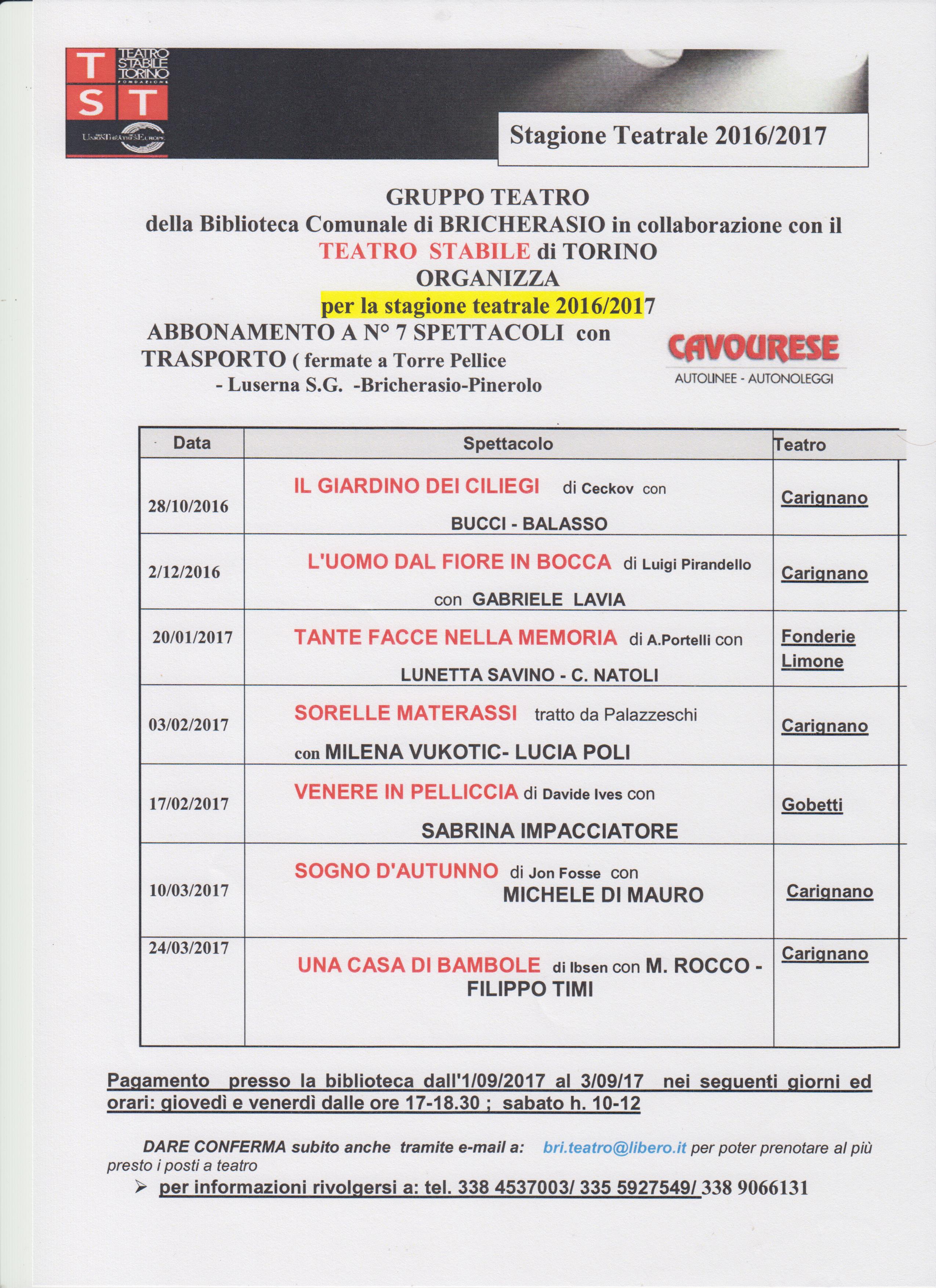 Anche quest’anno il Gruppo Teatro Bricherasio con il Teatro Stabile di Torino, in collaborazione con la Biblioteca di Bricherasio, propongono la rassegna di teatro in prosa, che vede il secondo appuntamentoVenerdì 2 dicembre 2016 in cui gli abbonati potranno assistere alla rappresentazione de “L’uomo dal fiore in Bocca” di Luigi Pirandello. Si tratta di una commedia in un solo atto il cui protagonista, un uomo comune dalla vita comune, scopre di essere destinato a morire a causa di un tumore. La sua reazione non è di disperazione o rassegnazione, ma piuttosto muta il suo modo di vedere il mondo e le piccole cose della vita quotidiana; queste assumono improvvisamente un’importanza vitale per il protagonista consapevole di viverle per l’ultima volta. Pirandello ripropone con questa rappresentazione il pensiero per cui una cosa acquista valore solo nel momento in cui si è consapevoli di perderla. La scena si svolge in una sala d’attesa di una stazione ferroviaria, in cui il protagonista dialoga con un avventore, e prende spunto dai problemi che gli vengono raccontati da quest’ultimo per dare il via ad una riflessionesull'esistenza, sull’importanza della quotidianità e dei dettagli delle cose. Ciò che all'inizio potrebbe sembrare nient'altro che una fissazione maniacale per i particolari si rivela un tentativo disperato, da parte di un uomo consapevole di morire, di mantenere un punto di contatto con la vita. Nonostante la presenza del tema della morte, Pirandello riesce a strappare al pubblico qualche amaro sorriso, con l’umorismo grottesco che caratterizza le sue opere.Lo spettacolo avrà luogo al Teatro Carignano alle ore 21. Vi ricordiamo che con l’abbonamento è compreso il trasporto in pullman, con fermate a Torre Pellice, Luserna San Giovanni, Bricherasio e Pinerolo. Gli orari di partenza sono: Torre Pellice - h. 18.50, Luserna san Giovanni - h. 18.55, Bricherasio - h. 19.05 e Pinerolo - h. 19.15. Per informazioni rivolgersi ai numeri 338/4537003 oppure 335/5927549.