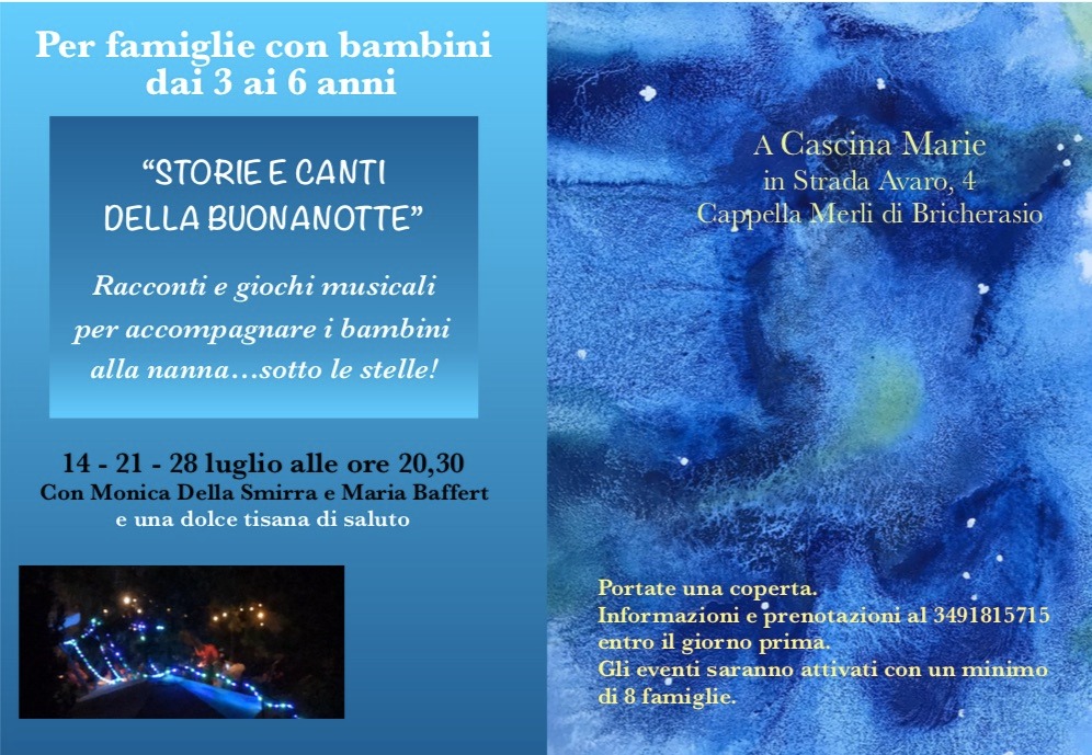 Cascina Marie in Strada Avaro, 4 a Cappella Merli di Bricherasio organizza per famiglie con bambini dai 3 ai 6 anni un ciclo di tre serate a tema "Storie e canti della buonanotte" con racconti e giochi musicali per accompagnare i piccoli alla nanna sotto le stelle e una dolce tisana di saluto. Gli appuntamenti sono condotti da Monica Della Smirra e Maria Baffert e si svolgono giovedì 21 e 28 luglio con inizio alle ore 20,30. Ai partecipanti viene richiesto di portare una coperta e gli eventi saranno attivati con un minimo di otto famiglie. Per maggiori informazioni e prenotazioni entro il giorno precedente telefonare al 349/1815715.