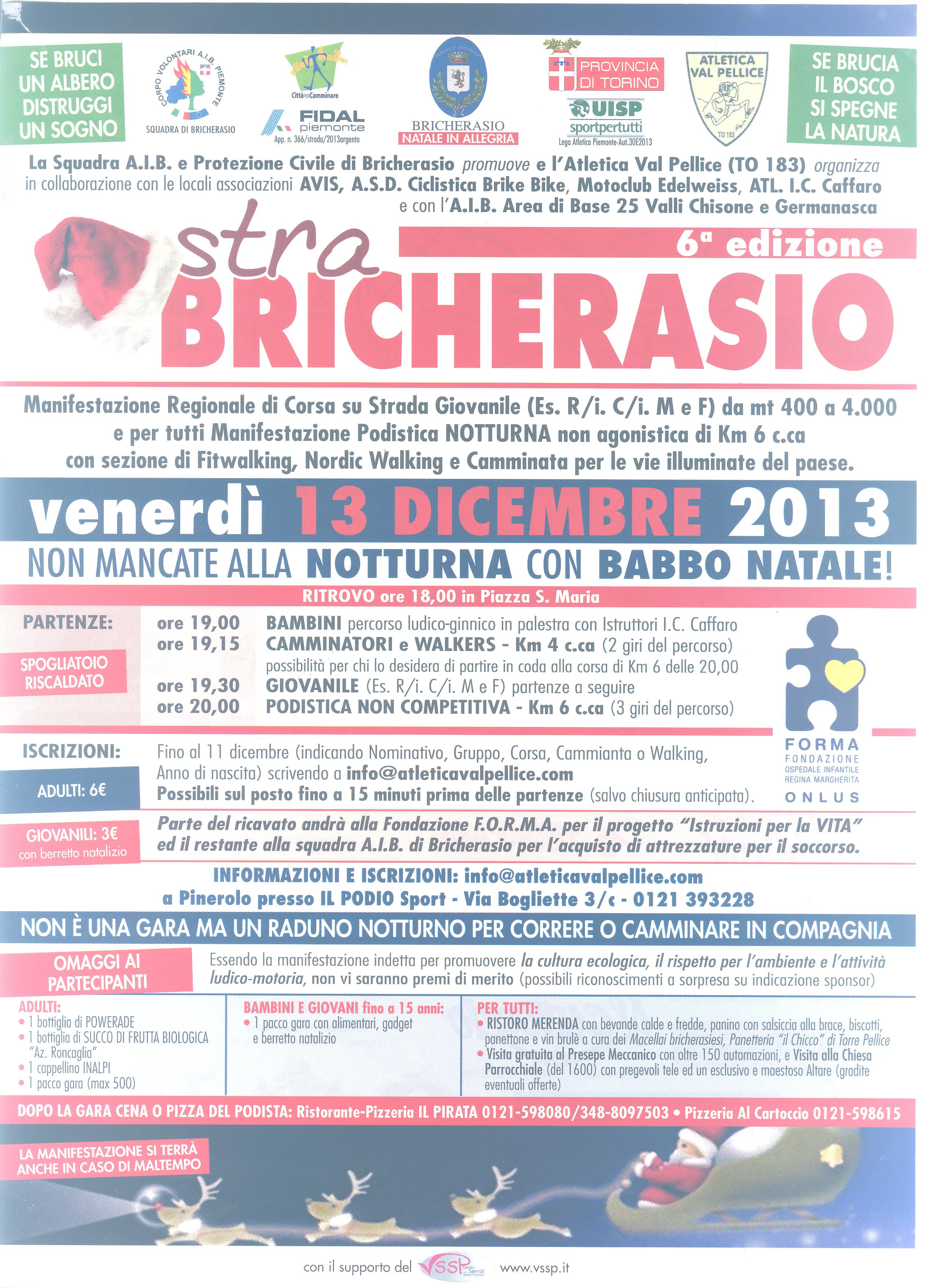 La Squadra AIB e Protezione civile di Bricherasio promuove e l’Atletica Val Pellice organizza in collaborazione con le locali associazioni Avis, Brike Bike, Motoclub Edelweiss e l’Istituto Caffaro per venerdì 13 dicembre la sesta edizione della StraBricherasio, manifestazione regionale di corsa su strada giovanile e podistica notturna non competitiva con sezioni di Fitwalking, Nordic Walking e camminata a passo libero libera a tutti per le vie illuminate di Bricherasio con Babbo Natale. Il ritrovo per le iscrizioni è alle ore 18,00 in Piazza Santa Maria a Bricherasio, la partenza dei bambini su percorso ludico-ginnico in palestra con istruttori alle ore 19. I camminatori e i walkers partono alle 19,15 per un percorso di circa 4 km. Alle 19,30 i giovani e alle 20 la podistica non competitiva di 6 km. Per iscrizioni fino a mercoledì 11 dicembre scrivere a info@atleticavalpellice.com o recarsi al Podio Sport di Via Bogliette, 3/C a Pinerolo e si può aderire sul posto fino a 15 minuti prima della partenza. Parte del ricavato andrà alla Fondazione F.O.R.M.A. per il progetto “Istruzioni per la vita” ed il restante alla squadra AIB sdi Bricherasio per l’acquisto di attrezzature per il soccorso. Essendo la manifestazione indetta per promuovere la cultura ecologica, il rispetto per l’ambiente e l’attività ludico motoria non sono previsti premi di merito ma a tutti i partecipanti sarà consegnato un pacco gara con generi alimentari oltre al ristoro all’arrivo con bevande calde e fredde, panini con salsiccia alla brace, biscotti, panettoni e vin brulè. Dopo la gara cena o pizza del podista al Ristorante-Pizzeria “Il Pirata” e alla Pizzeria “Al Cartoccio”.