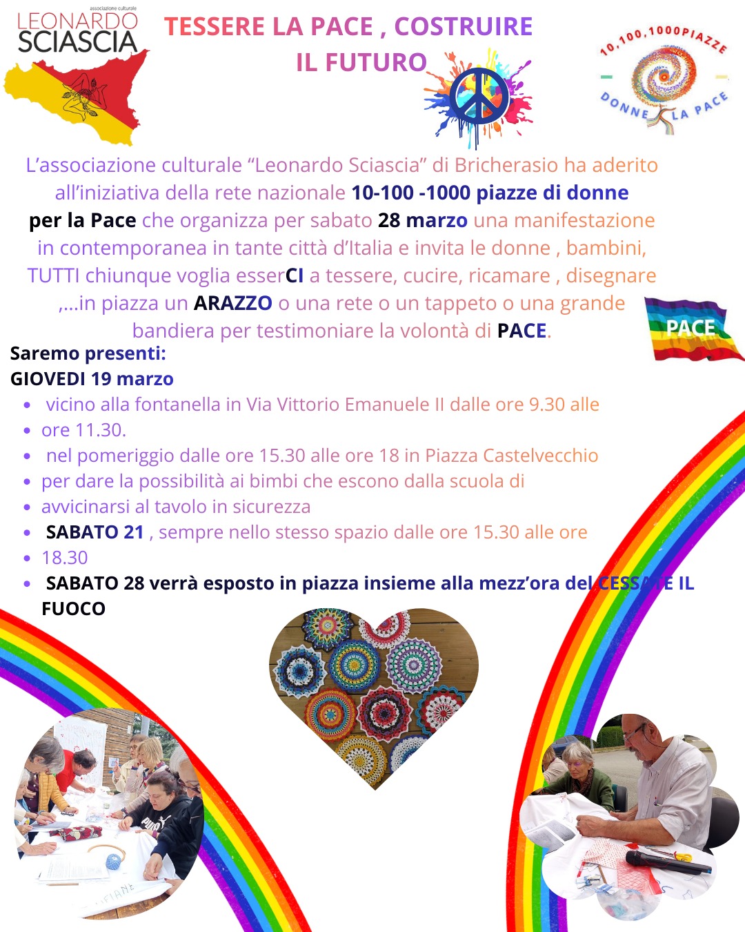 L’Associazione Leonardo Sciascia ha aderito all’iniziativa della rete nazionale 10-100-1000 piazze di donne per la Pace che organizza per sabato 28 marzo una manifestazione in contemporanea in tante città d’Italia e invita le donne a tessere, cucire, ricamare e disegnare in piazza un arazzo, una rete, un tappeto o una grande bandiera per testimoniare la volontà di pace. Anche a Bricherasio si prova ad assemblare un arazzo della pace con l’aiuto di adulti e bambini e chiunque voglia esserci è benvoluto giovedì 19 marzo vicino alla fontanella in Via Vittorio Emanuele II dalle ore 9,30 alle 11,30 e nel pomeriggio dalle 15,30 alle 18 in Piazza Castelvecchio per dare la possibilità ai bimbi che escono da scuola di avvicinarsi al tavolo in sicurezza e ci si ritrova anche il pomeriggio di sabato 21, sempre nello stesso spazio e orario.