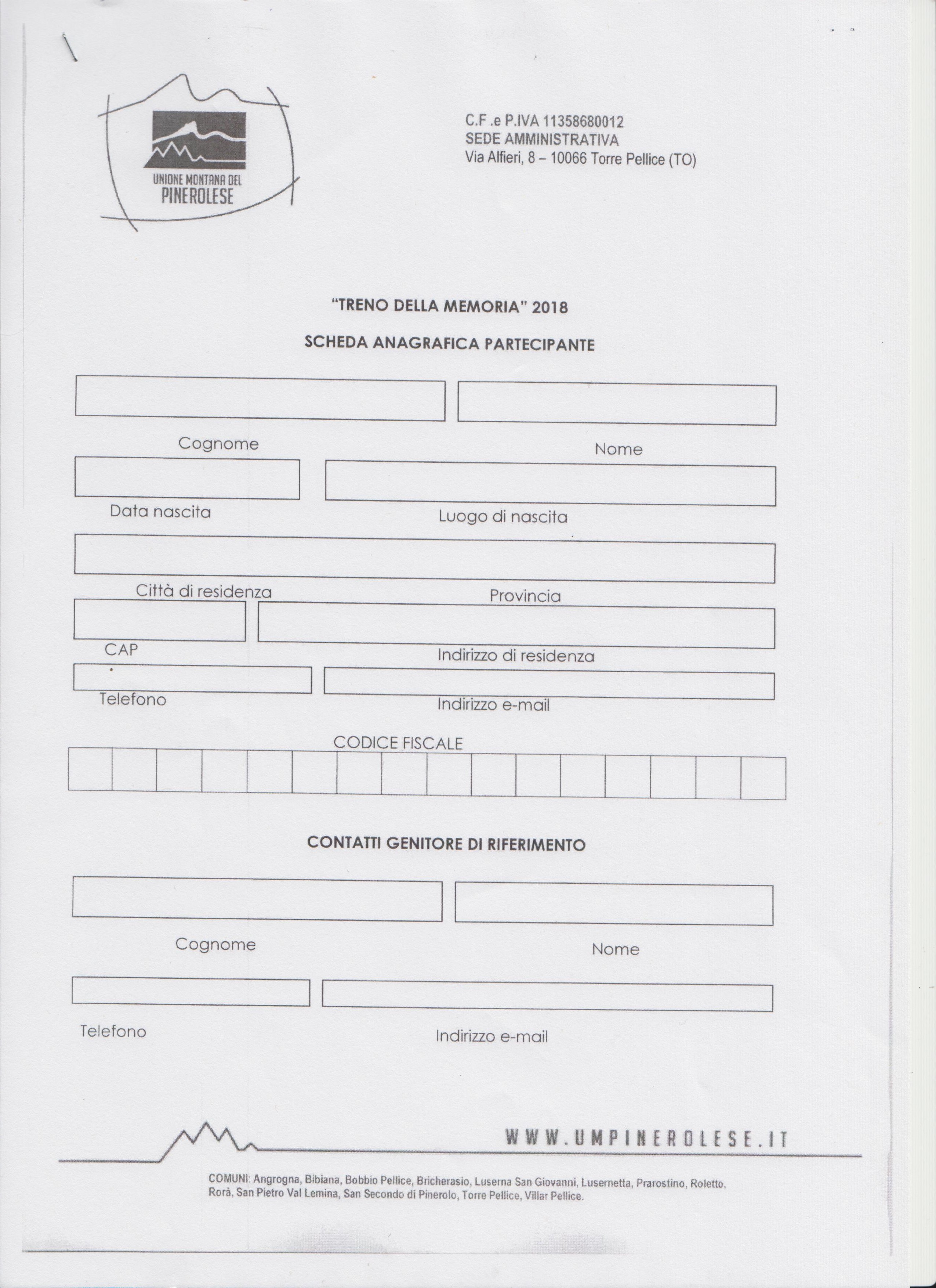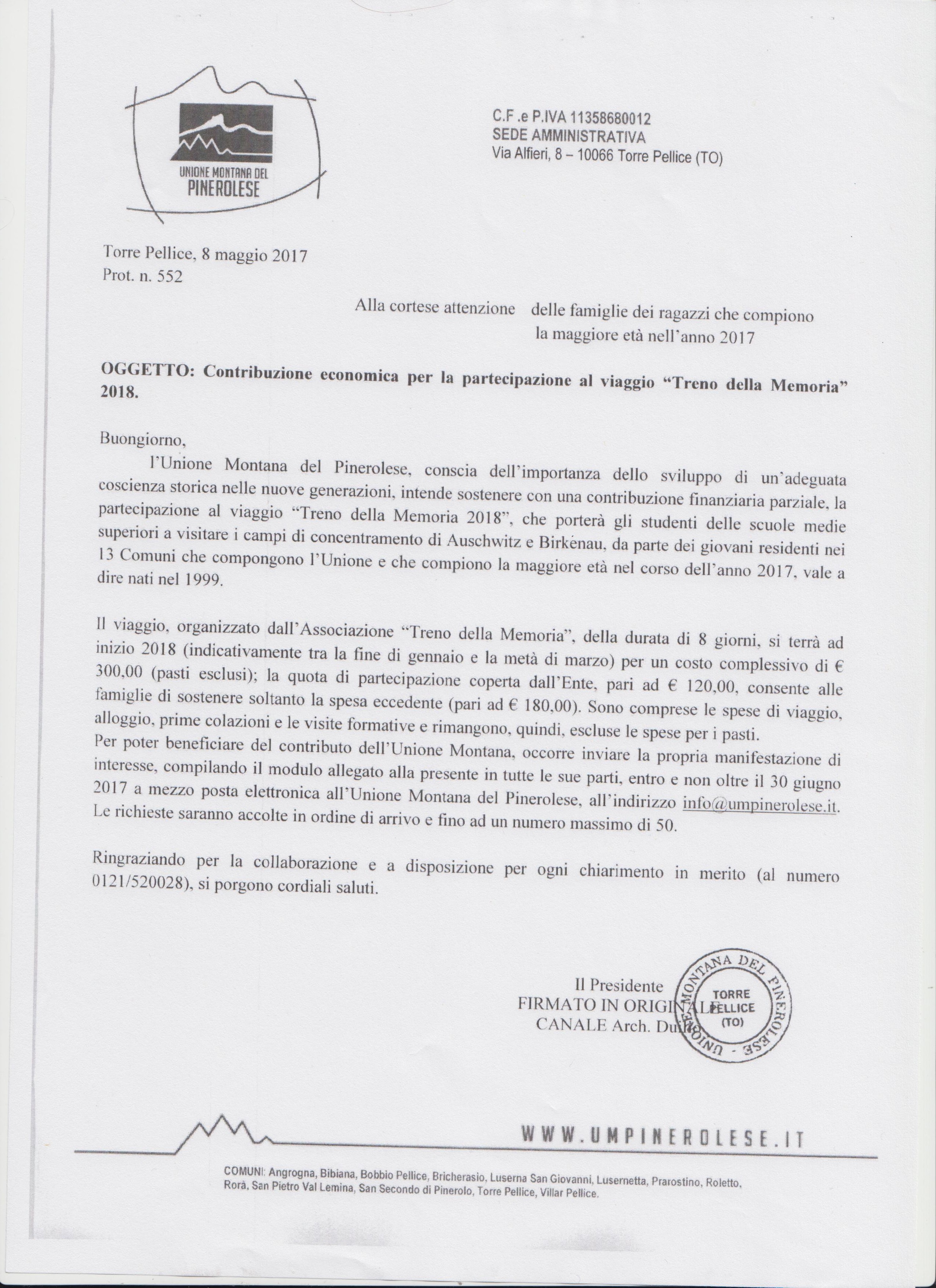 Il Comune di Bricherasio comunica alle famiglie dei ragazzi che nel corso del 2017 diventano maggiorenni che l’Unione Montana del Pinerolese ha deciso di sostenere con un contributo parziale la partecipazione al viaggio “Treno della Memoria 2018” che porterà i ragazzi delle scuole medie e superiori a visitare i campi di concentramento di Auschwitz e Birkenau. Il viaggio della durata di otto giorni, organizzato dall’Associazione “Treno della Memoria” si tiene all’inizio del prossimo anno, indicativamente tra la fine di gennaio e la metà di marzo per un costo complessivo di 300 €. La quota di partecipazione coperta dall’Unione, pari ad € 120 consente alle famiglie di pagare la spesa eccedente di € 180. Sono comprese le spese di viaggio, alloggio, prime colazioni e le visite formative e rimangono esclusi i pasti che saranno a carico dei partecipanti. Per poter beneficiare del contributo occorre inviare la propria manifestazione di interesse, compilando il modulo scaricabile all’indirizzo internet www.comune.bricherasio.to.it nella sezione appuntamenti ed inviarlo, entro venerdì 30 giugno, a mezzo posta elettronica a info@umpinerolese.it. Le richieste saranno accolte in ordine di arrivo fino ad un numero massimo di 50. Per ulteriori informazioni e chiarimenti in merito telefonare al numero 0121/520028.