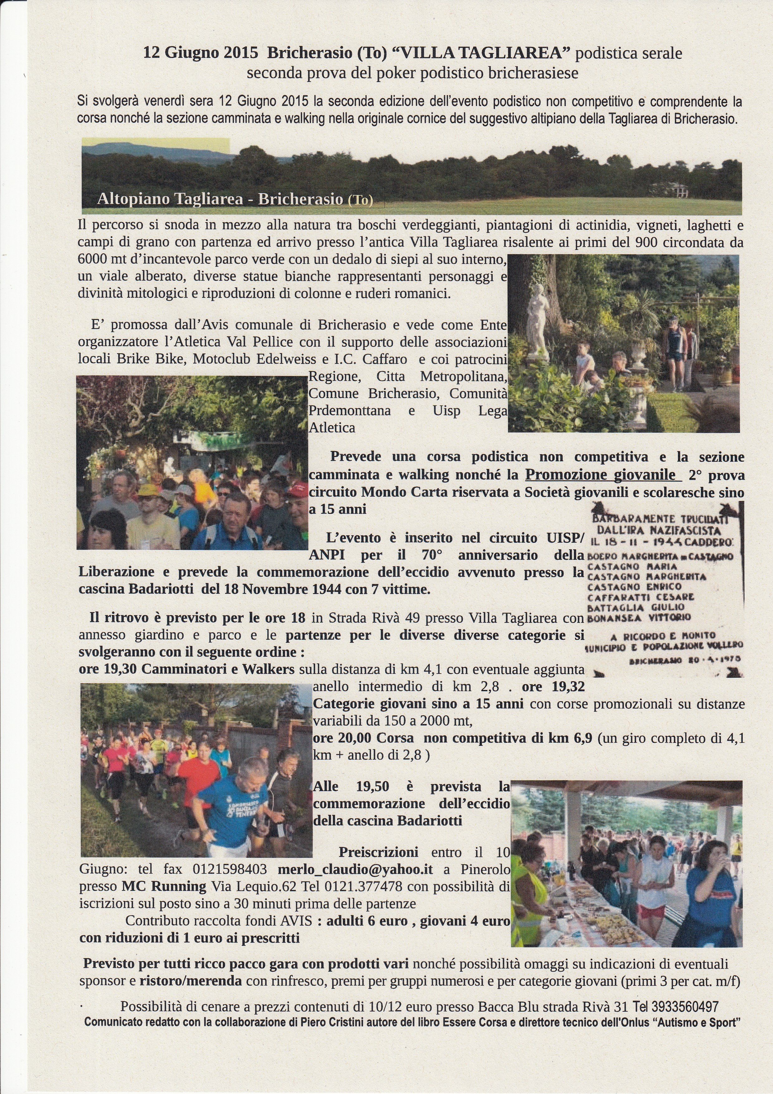 1^ edizione della corsa podistica “Villa Tagliarea” promossa dall'Avis ed organizzata dall’Atletica Valpellice con l’appoggio delle locali associazioni Brike Bike, Motoclub Edelweiss ed Istituto Comprensivo “Caffaro” per la sera di venerdì 12 giugno. Podistica non competitiva con sezione di camminata/walking sul piccolo ma incantevole altopiano della Tagliarea di Bricherasio tra boschi, laghetti e campi, e corsa promozionale giovanile. Il ritrovo dalle ore 18 presso la Villa di inizio '900 e le partenze scaglionate per categoria dalle 19,30. Si precisa che non è una gara ma un raduno podistico per stare in compagnia correndo o camminando. Le iscrizioni entro il 10 giugno per email a merlo_claudio@yahoo.it o presso MC Running di Via Lequio 62 a Pinerolo e 30 minuti prima della partenza. Il contributo di partecipazione richiesto è di 6 euro per gli adulti e di 4 euro per i giovani e per i preiscritti riduzione di 1 euro. Omaggio a tutti i partecipanti di un pacco gara oltre al ristoro con rinfresco sul posto composto da bevande, biscotti, frutta e dolci. Prevista la cena del podista a modesti prezzi presso l’Agriturismo “La Bacca Blu” di Strada Rivà, 31 a Bricherasio.