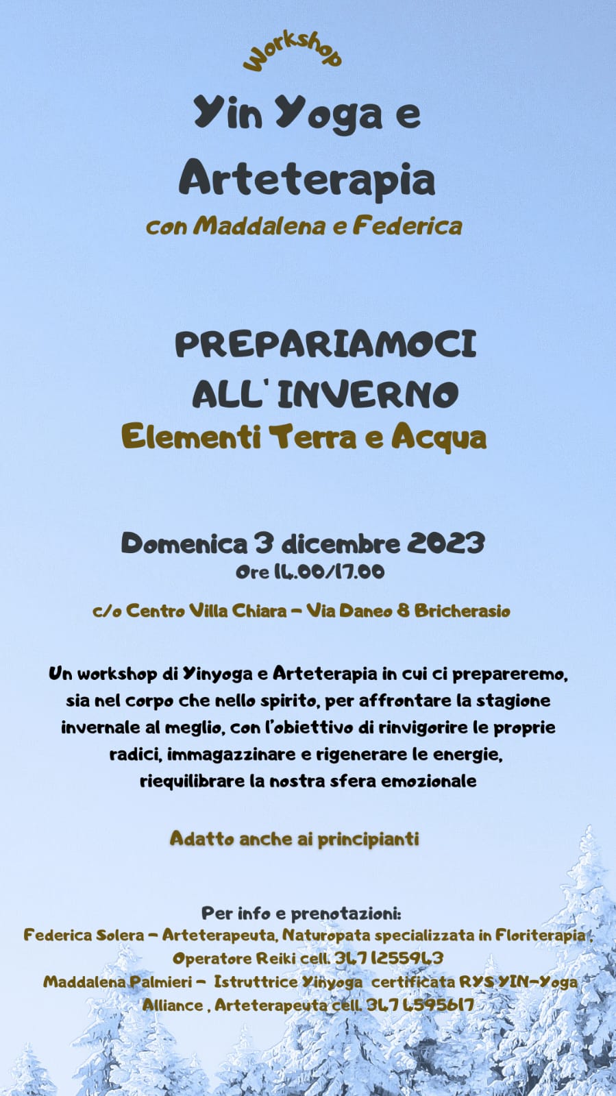 Domenica 3 dicembre dalle ore 14.00 alle ore 17.00 si svolge il workshop di Yin Yoga e Arteterapia per la preparazione ad affrontare la stagione dell'inverno al meglio sia nel corpo che nello spirito e portare equilibrio al corpo, alla mente e alla sfera emozionale con l’obiettivo di rinvigorire le proprie radici immagazzinando e rigenerando le energie. L’evento è aperto a tutti, anche ai principianti e non è necessario avere abilità artistiche. Maggiori informazioni e prenotazioni dall’arteterapeuta specializzata in Floriterapia Federica Solera al numero 347/1255943 oppure dall’istruttrice di Yin Yoga Maddalena Palmieri al 347/4595617.