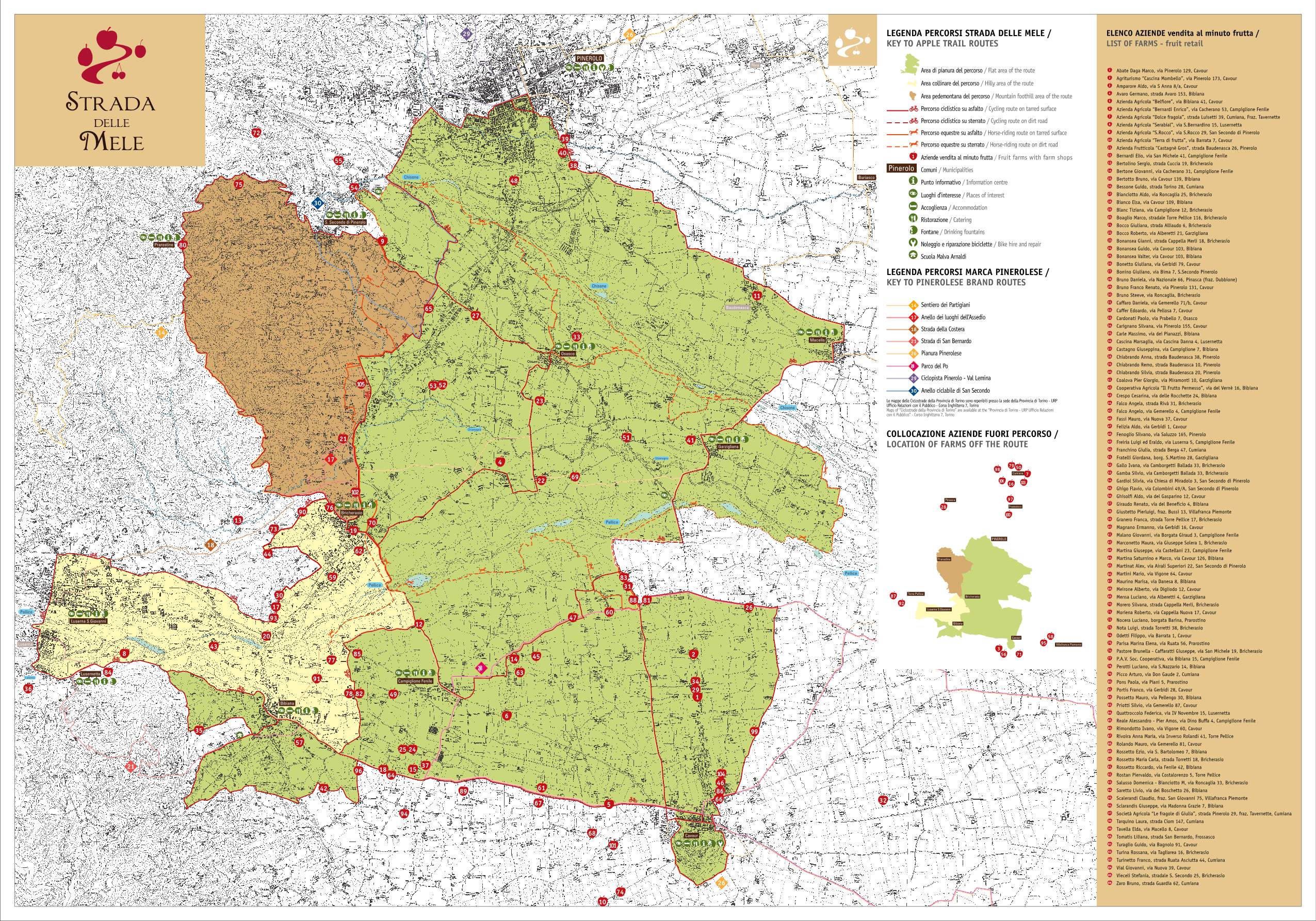 Cartina completa dei percorsi della "Strada delle Mele Pinerolese" di cui il nostro Comune fa parte. Data la particolare ricchezza e varietà del territorio collinare, per Bricherasio passano oltre all'itinerario principale che congiunge tutti i 15 comuni facenti parte della Strada, anche tre anelli secondari: la variante "anello collinare", la variante "anello pedemontano" e la "variante di Osasco".