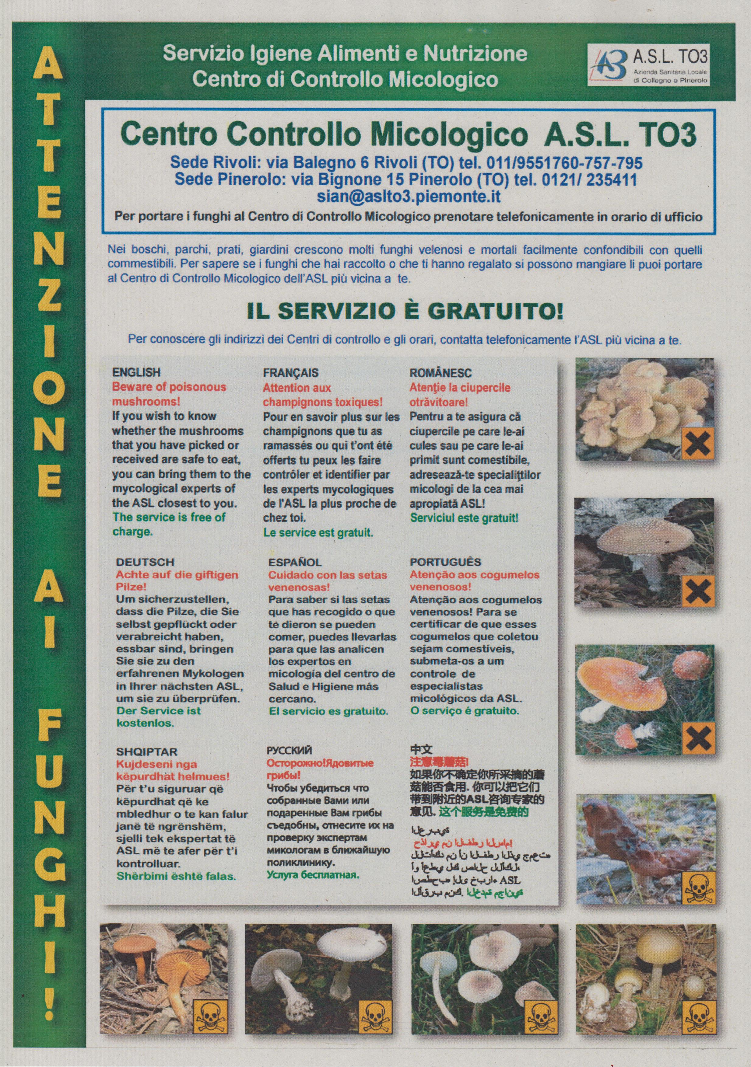 Inoltre l'ASL TO3 ha predisposto un avviso multilingue per informare circa i pericoli dovuti alla raccolta di specie velenose che possono trovarsi anche nei prati e parchi urbani.