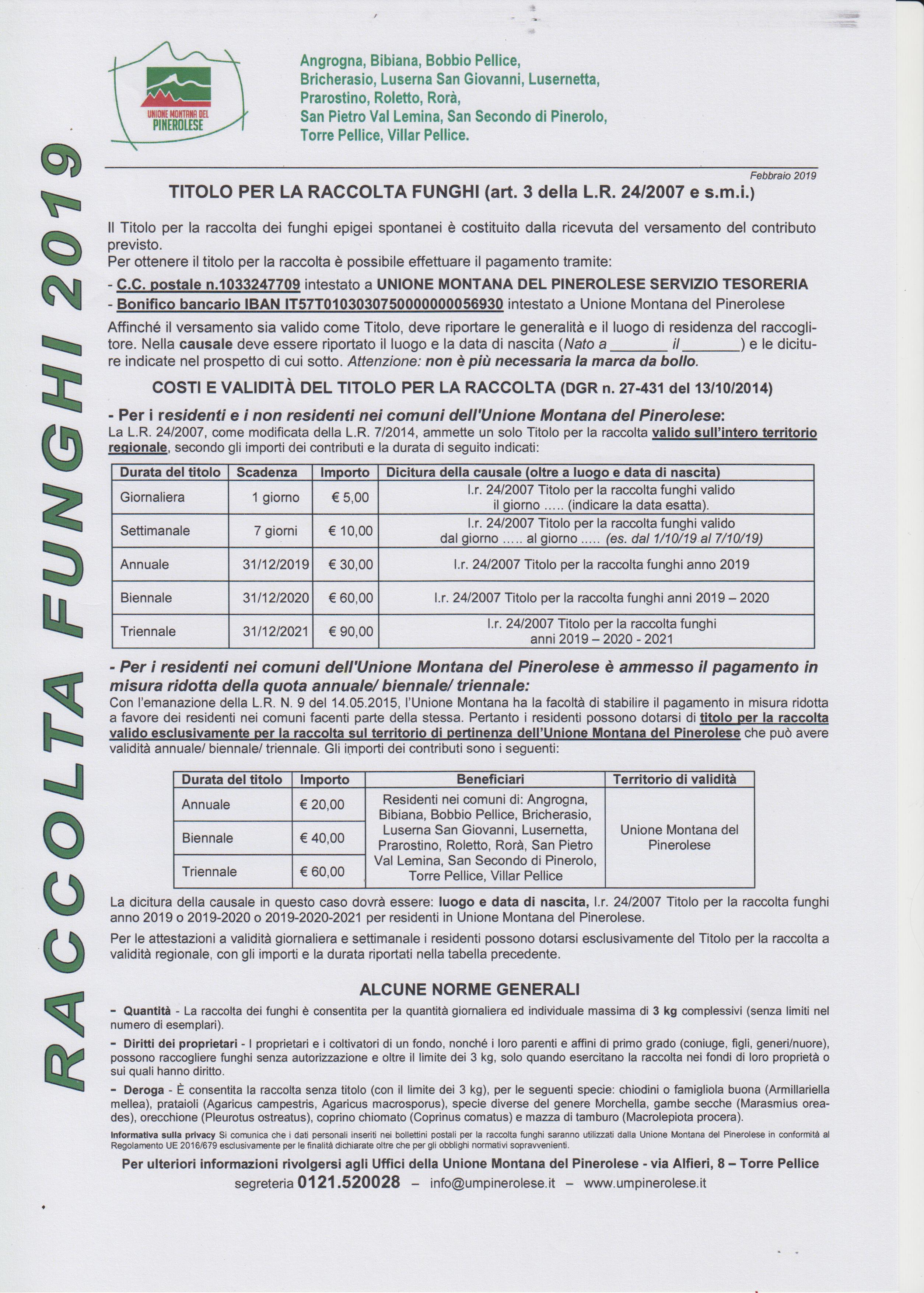 Indicazioni operative per il rilascio del titolo autorizzativo necessario per la raccolta funghi da parte dell'Unione Montana del Pinerolese.