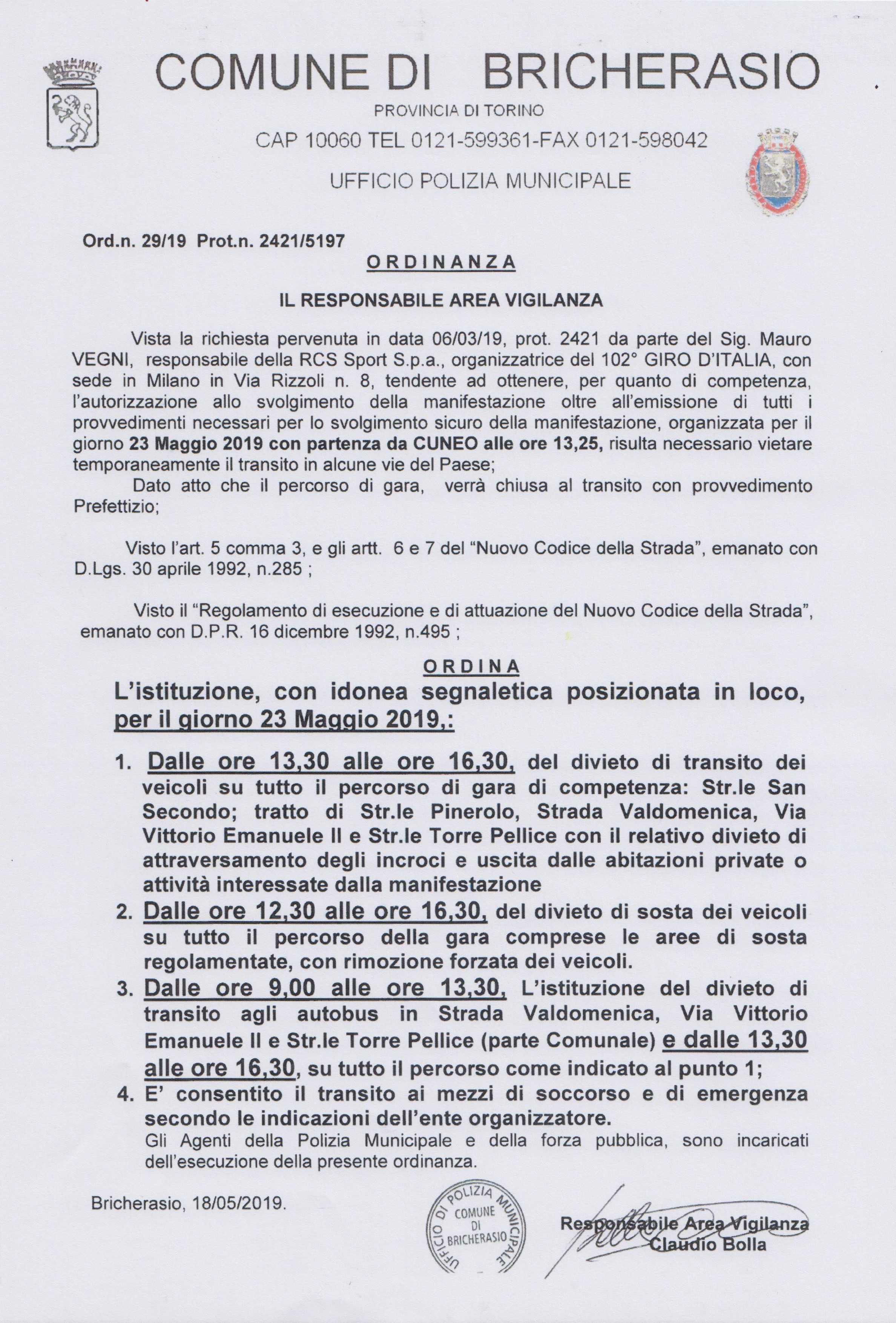 Ordinanza chiusura strade per Giro d'Italia