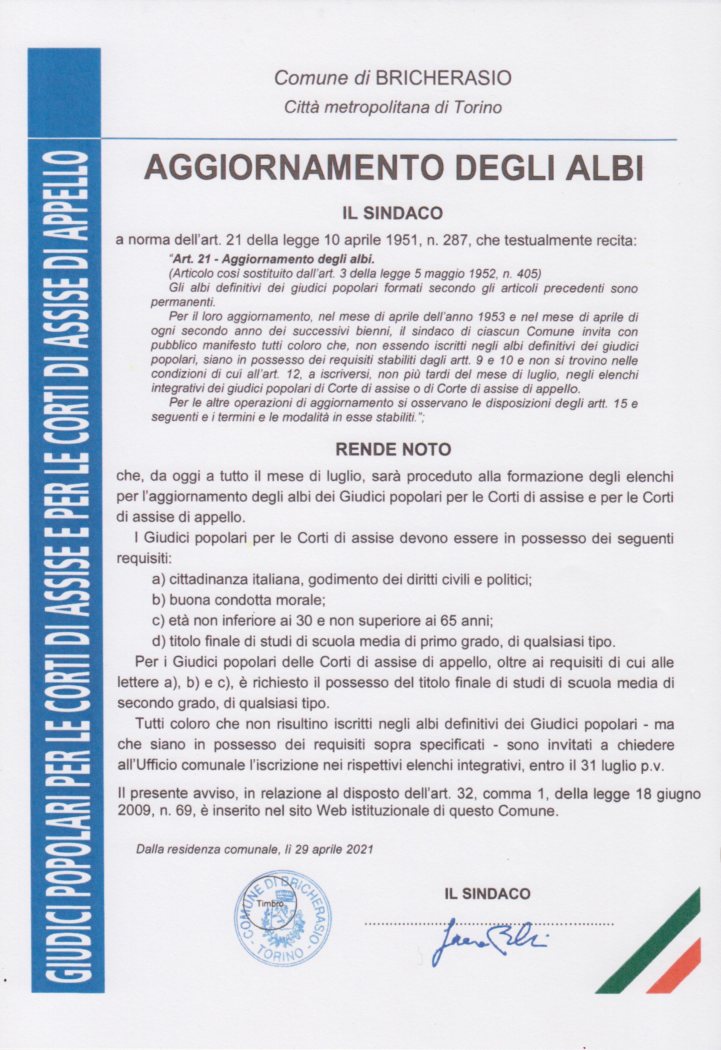 E' in corso l'operazione di aggiornamento dell'Albo dei giudici popolari per le Corti d'assise e per le Corti d'assise di appello. Informazioni e dettagli nello stampato allegato.