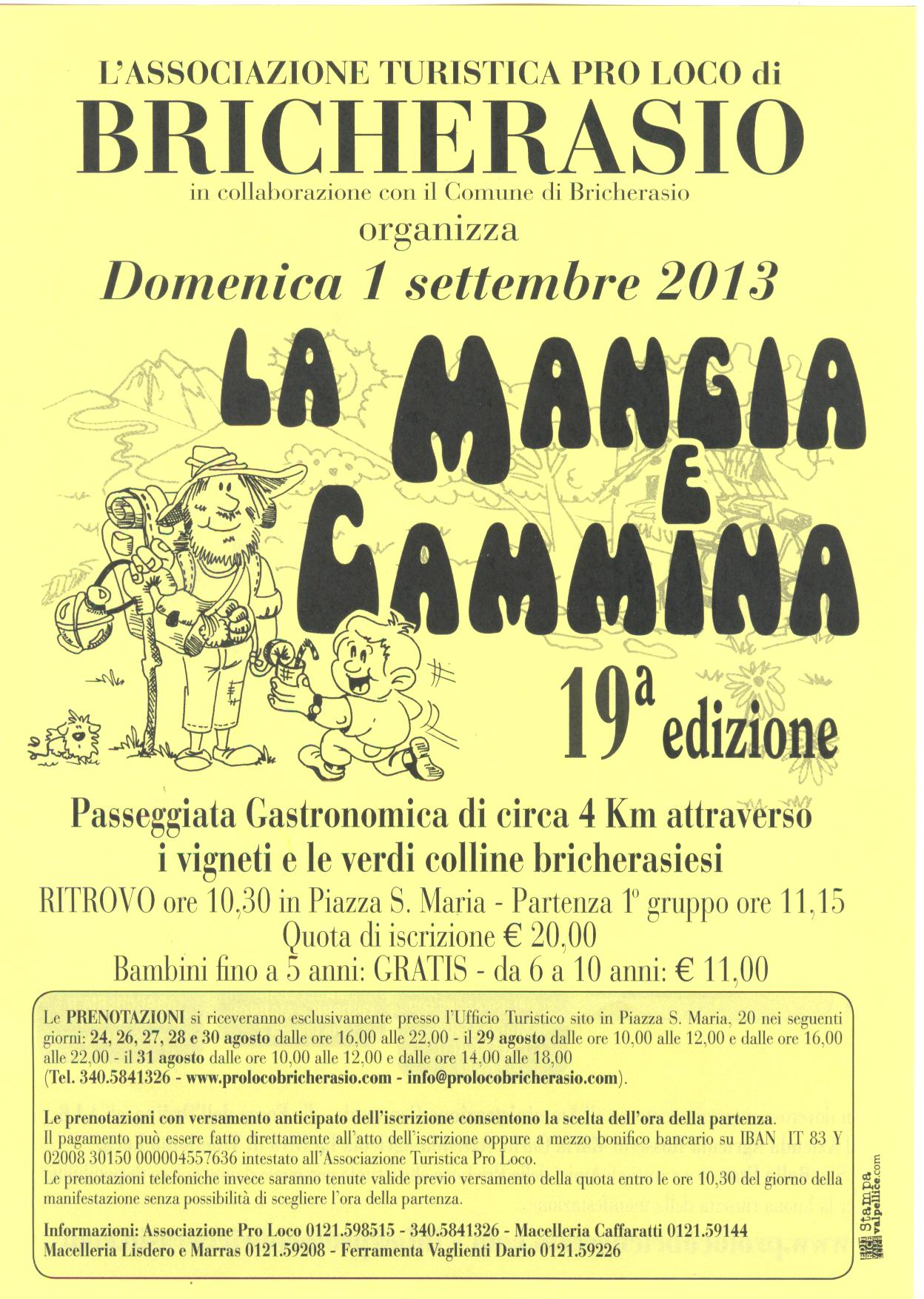 A Bricherasio torna per la diciannovesima edizione la ”Mangia e Cammina”, la camminata attraverso i vigneti e le verdi colline bricherasiesi partirà alle ore 11.15 di Domenica 1 settembre. Alla buona cucina che si può gustare in sette comode tappe raggiunte con una sana passeggiata in zone panoramiche, si inizia con l'aperitivo, 2 postazioni con antipasti tipici, una postazione con il sorbetto, nella tappa successiva si possono gustare degli ottimi agnolotti alla piemontese ed un minestrone casalingo, come secondo una grande grigliata, e all’arrivo, i partecipanti saranno accolti sul piazzale della collina del castello per la frutta, il dessert, il caffè e il digestivo, allietati da canti, musiche, balli, divertimento e tanta allegria per tutta la giornata. il tutto innaffiato da vino ed acqua a volontà. Tutta la macchina organizzativa è operativa per la diciannovesima edizione e le prenotazioni si riceveranno presso l’Ufficio turistico in Piazza Santa Maria n. 20 nei seguenti giorni: 24. 26, 27, 28 e 30 agosto dalle ore 16 alle ore 22, giovedì 29 pure la mattina dalle ore 10 alle 12 e sabato 31 agosto dalle 10 alle 12 e dalle 14 alle 18. Le prenotazioni con versamento anticipato dell’iscrizione consentono la scelta dell’ora di partenza. Il pagamento può essere fatto direttamente all’atto dell’iscrizione oppure presso tutte le agenzie bancarie tramite bonifico su IBAN IT 83 Y 02008 30150 000004557636 intestato all’Associazione Pro Turistica Pro Loco di Bricherasio. Le prenotazioni telefoniche
