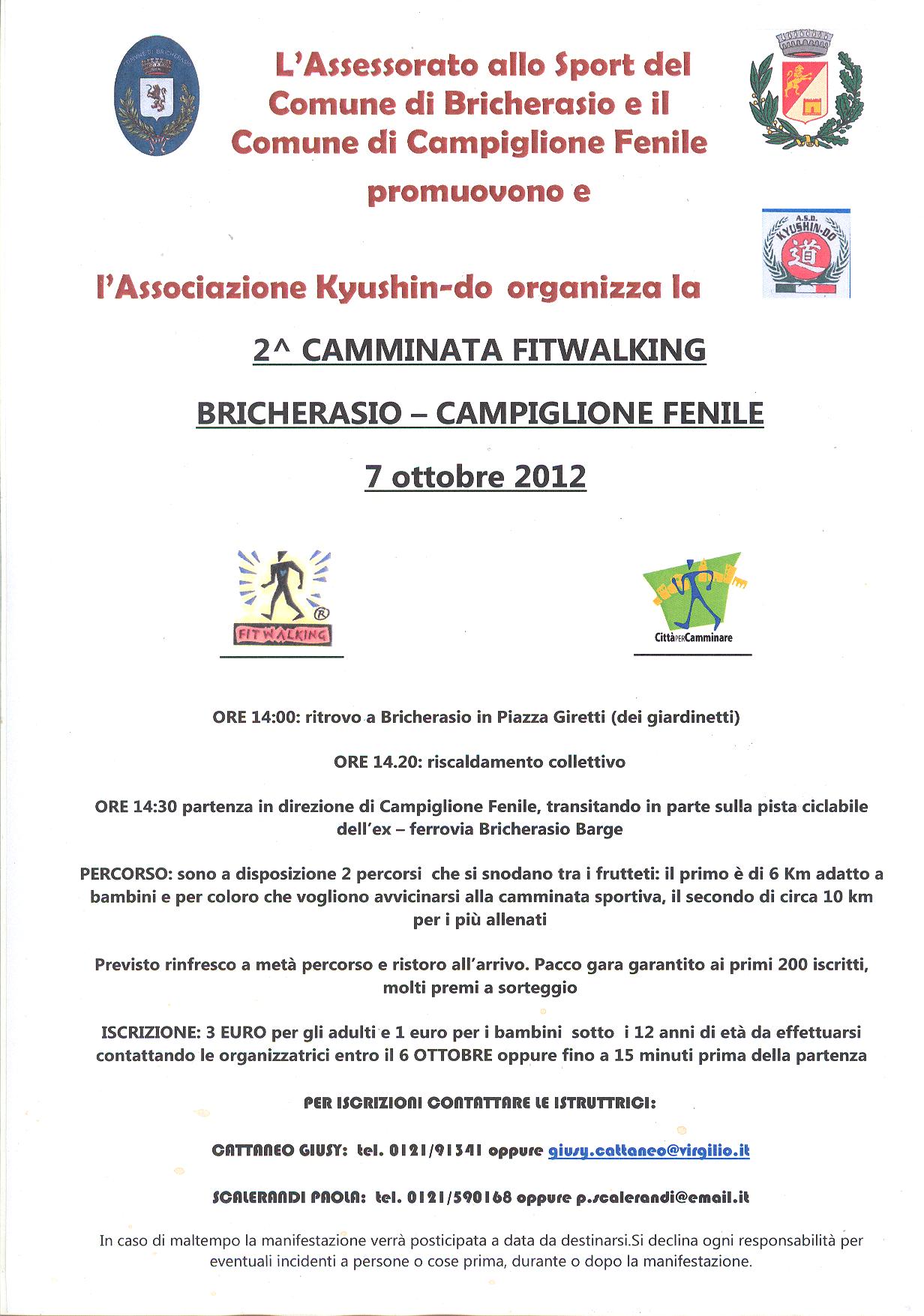 L’Assessorato allo Sport del Comune di Bricherasio in collaborazione con il Comune di Campiglione Fenile e l’Associazione Kyuschin-Do promuove per Domenica 7 ottobre la seconda camminata di fitwalking da Bricherasio a Campiglione Fenile. Dopo il ritrovo alle 14 ai giardinetti di Piazza Giretti per un riscaldamento collettivo alle 14,30 la partenza in direzione Campiglione Fenile, transitando in parte sulla pista ciclabile ricavata dall’ex ferrovia Bricherasio-Barge. Sono a disposizione due percorsi pianeggianti che si snodano tra i frutteti; il primo di circa 6 km adatto per i piccoli e per coloro che vogliono cimentarsi nella camminata, l’altro di circa 10 km per i più allenati. Previsto un ristoro a metà percorso e il rinfresco all’arrivo con il pacco gara garantito ai primi 200 iscritti e premi a sorteggio al termine della manifestazione. L’iscrizione costa 3,00 € per gli adulti e 1,00 € per i bambini sotto i 12 anni e si può effettuare telefonando a Giusy Cattaneo al numero 0121/91341 e Scalerandi Paola allo 0121/590168 oppure in via telematica mediante e-mail a giusy.cattaneo@virgilio.it e p.scalerandi@email.it e anche fino a 15 minuti prima della partenza. A disposizione il sito www.fitwalking.it. Avvicinarsi alla tecnica del fitwalking significa rendere il modo di camminare sufficientemente efficace da potersi muovere ad una elevata velocità mantenendo una gestualità naturale. Per iniziare ad acquisire una buona tecnica si deve innanzitutto individuare la giusta postura e, via via, ottenere confidenza con questo tipo di azione. Un buon fitwalker non cammina impettito come un soldatino di piombo ma il suo movimento è molto armonioso e finalizzato alla ricerca di un’ottima spinta atta a favorire la fase di accelerazione del corpo.