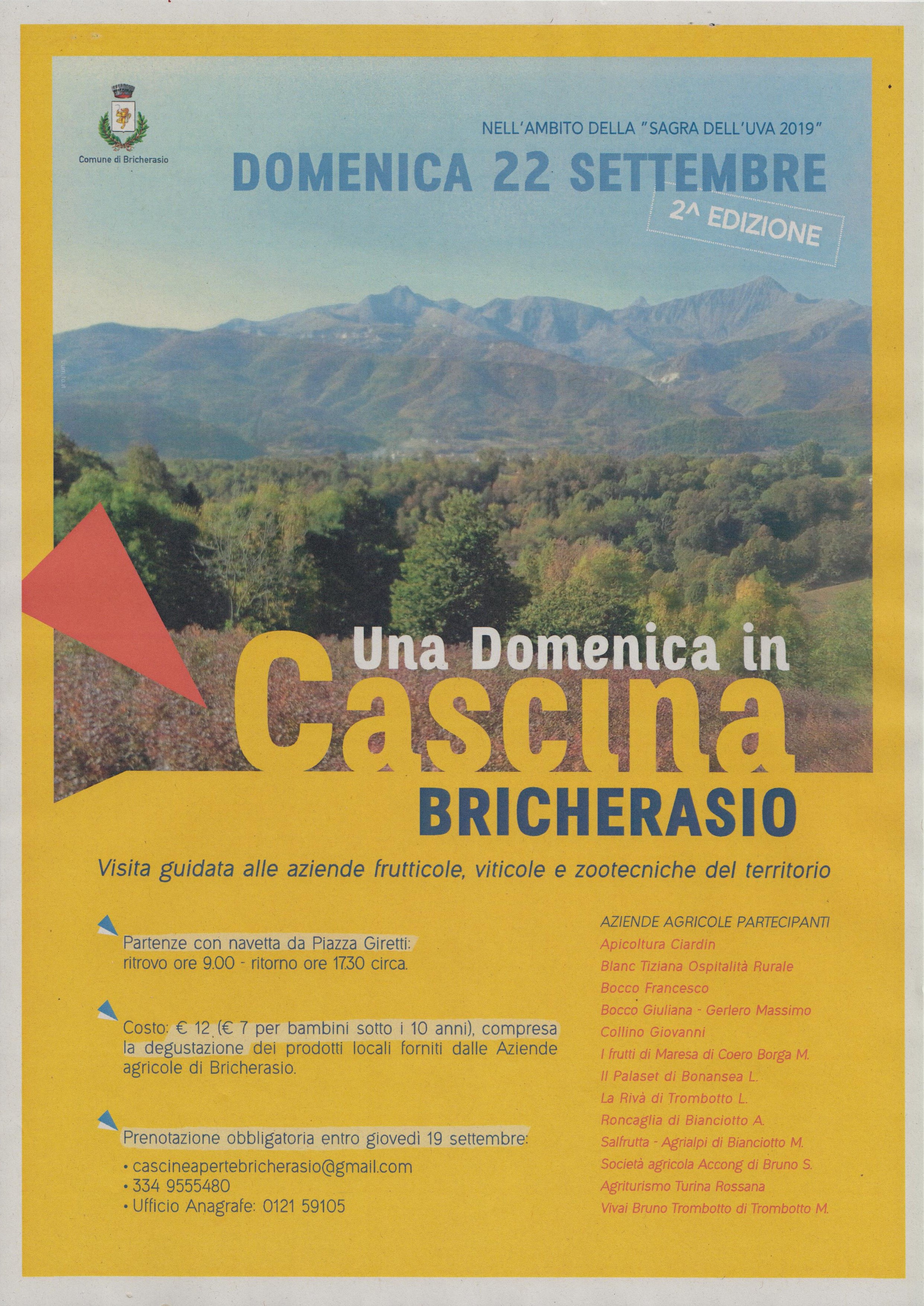 Una delle novità della passata edizione della Sagra dell'Uva bricherasiese che ha avuto grande successo è stata la visita guidata alle aziende frutticole, viticole e zootecniche del territorio, organizzata dal Comune in collaborazione con una decina di aziende agricole. L'iniziativa viene riproposta Domenica 22 settembre. Partenze con navetta alle ore 9:00 dal Salone Polivalente. Costo: € 12 (€ 7 per bambini fino a 10 anni), inclusa la degustazione di prodotti locali forniti dalle aziende agricole di Bricherasio. Prenotazione obbligatoria entro giovedì 19 settembre (cascineapertebricherasio@gmail.com, 334-9555480 oppure presso l'ufficio anagrafe al 0121-59105).