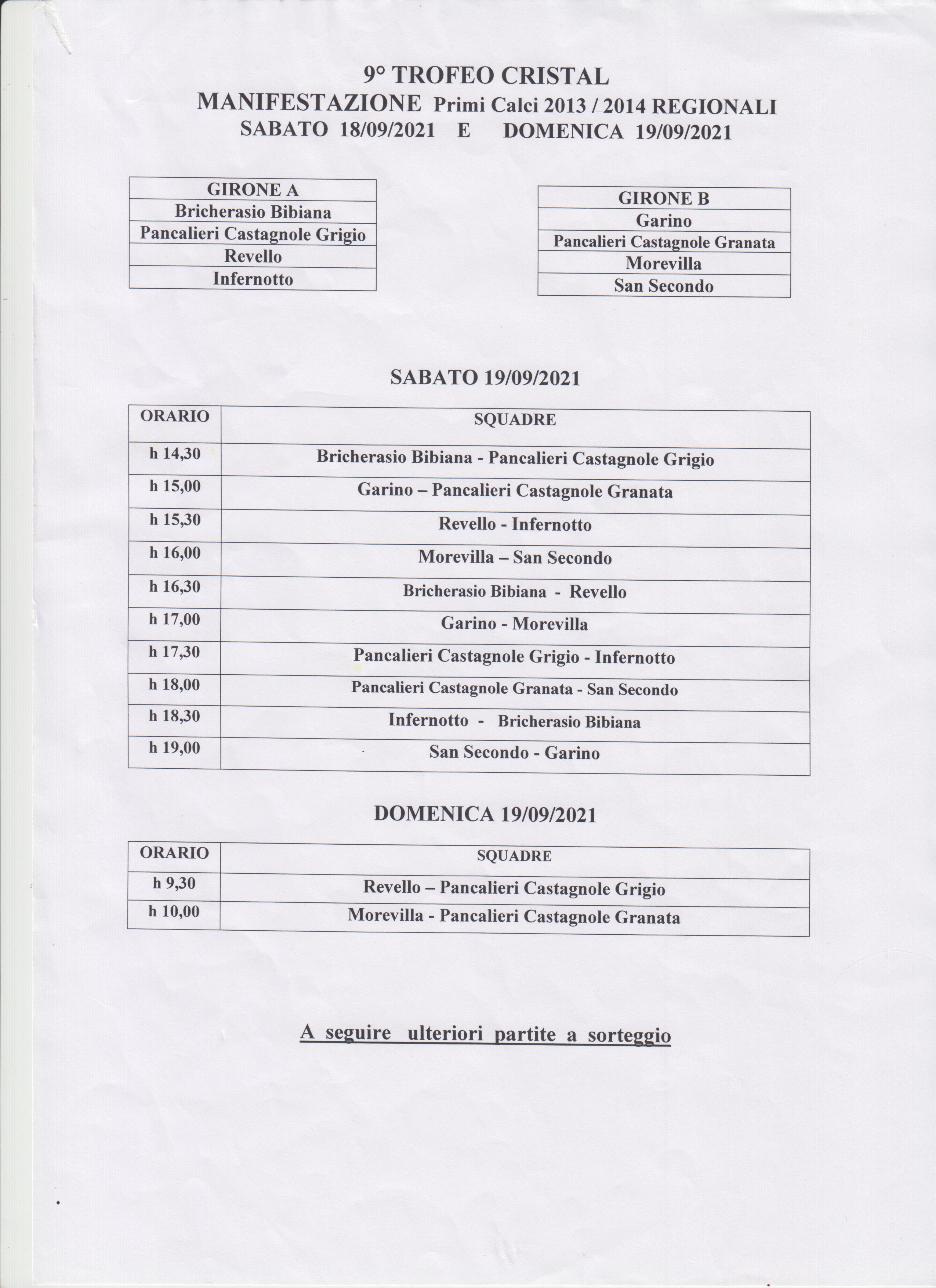Il Bricherasio Bibiana è tornato a calpestare il manto erboso del "Calleri di Sala" dopo due anni tribolati per il Covid organizzando la 30^ edizione del torneo giovanile di calcio Comune di Bricherasio all’interno della 53^ Sagra dell’Uva. Il Direttore Generale Andrea Gamba nonostante la pandemia ha allestito una competizione di tutto rispetto e anche nel fine settimana del 18 e 19 settembre scendono sul terreno di gioco per contendersi il primo trofeo Mafalda Industries S.r.l. gli Esordienti a 9 nati nel 2010 con le otto squadre divise in due gironi. Con i padroni di casa fanno parte del girone A San Secondo, Scalenghe e Tetti Francesi mentre il secondo girone è composto da Cavour, Perosa, Piossasco, e Polisportiva Garino. Le prime due squadre di ogni girone accedono al gruppo che si sfida per la vittoria finale. Le altre giocano per la quinta posizione in un torneo di consolazione. Nella categoria Primi Calci 2013/14 identica formula per aggiudicarsi il nono trofeo Cristal e si gioca sul campetto in sintetico a 5 giocatori. Indossano le scarpette bullonate nel primo girone con la squadra ospitante del Bricherasio Bibiana, l’Infernotto, il Pancalieri Castagnole Grigio e il Revello e nel girone B a giocarsi l'accesso alle finali sono Morevilla, Pancalieri Castagnole Granata, Polisportiva Garino e San Secondo. Fischio d'inizio della prestigiosa kermesse fissato alle 14,30.