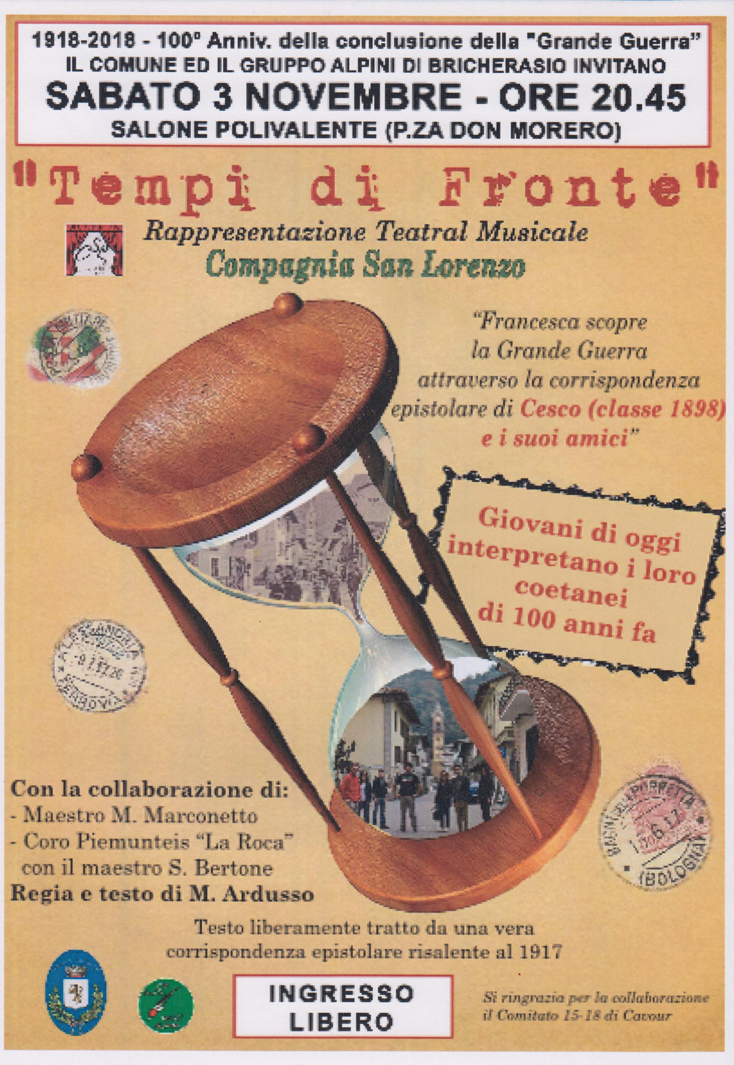 Il Comune di Bricherasio e il Gruppo Alpini invitano tutti i cittadini a partecipare alle celebrazioni per la Festa dell’Unità Nazionale e Giornata delle Forze Armate in occasione del 100º Anniversario della conclusione della “Grande Guerra”. Sabato 3 novembre alle ore 20,45 lo spettacolo teatrale “Tempi di Fronte" proposto dalla Compagnia San Lorenzo di Cavour al Salone Polivalente di Piazza Don Morero, ingresso libero. Domenica 4 le celebrazioni iniziano con il ritrovo in Piazza Santa Maria alle ore 9,15 al quale seguirà alle 9,45 alla Borgata Badariotti il ricordo del 74º Anniversario dell’Eccidio della famiglia Castagno. Alle 10,30 la Santa Messa che si celebra nella Chiesa Parrocchiale del capoluogo in ricordo dei caduti e dopo la funzione partenza del corteo per il cimitero per la deposizione di corone al Monumento ai Caduti, con l’orazione ufficiale e l’inaugurazione di una scultura lignea realizzata da Fabio Moriena in memoria dei caduti della Grande Guerra. Prevista la partecipazione della Filarmonica San Bernardino, al termine rinfresco in municipio. In caso di maltempo cerimonia presso l'ala comunale.