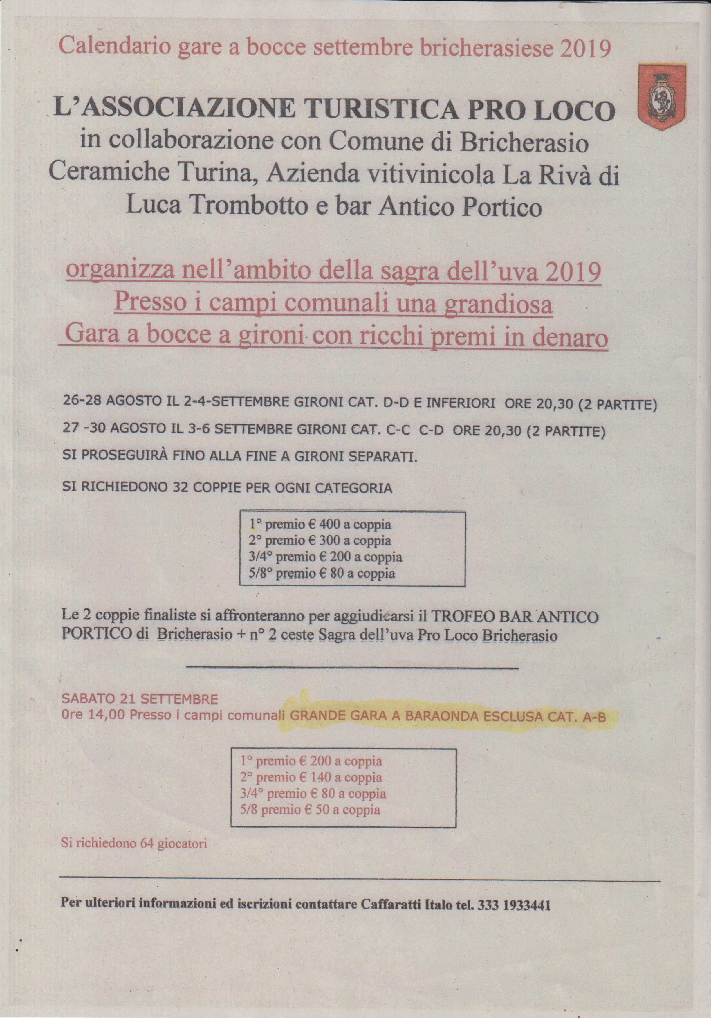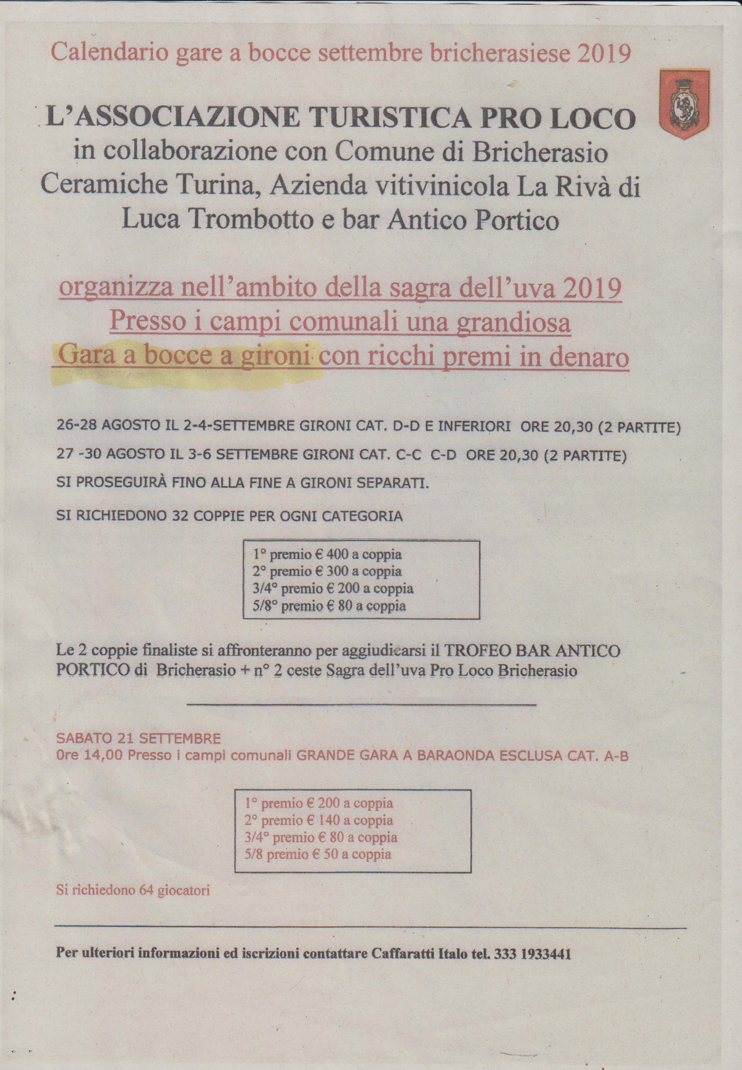 Alcuni appuntamenti sono diventati irrinunciabili all'interno della Sagra dell'Uva di Bricherasio giunta a 51 edizioni consecutive, anche se la giornata clou del settembre bricherasiese resta l'ultima domenica del mese con il Gran Mercato d'Autunno con i banchi dell'agroalimentare locale, mercatino delle pulci per le vie del paese, "Sicilia in festa", esposizione di modellismo statico, intrattenimento per bambini e giochi da tavolo per giovani e famiglie, a cura dell’Associazione ludico-culturale “Dimensione Arcana”, la mostra ortofrutticola, in municipio la mostra fotografica a tema libero con il ricordo di Augusto Cantamessa, la mostra d’arte a cura dell’Unitre di Bricherasio e la mostra fotografica “Bricherasio e la sua gente” a cura del Circolo Culturale Luigi Cesare Bollea. Novità 2019 l’Escape Room, al Salone Polivalente, con enigmi da risolvere in 20 minuti per poter uscire dalla sala: coinvolgente, intrigante e divertente gioco di squadra per gruppi da 4 a 8 partecipanti. La pausa pranzo è proposta alla Piazza del Gusto con inizio distribuzione dei piatti della tradizione proposti dai commercianti e dalla Pro Loco di Bricherasio, con possibilità di degustare le etichette DOC Pinerolese. Alle ore 14.30 parte la tradizionale sfilata dei carri allegorici per le vie del paese, accompagnati dalla Filarmonica San Bernardino ed esibizioni dell'Associazione Danza Sportiva Panda di Bricherasio, animazione musicale con Maurizio Delle Valli ed infine la distribuzione della maxi torta per festeggiare i 45 anni dalla fondazione dell’Associazione Pro Loco. Appuntamenti ormai consolidati sono la 16° corsa podistica "Giro del Belvedere” (Venerdì 6 settembre), la 25° passeggiata gastronomica di circa 4 km fra i filari e le verdi colline bricherasiesi nota come “Mangia e Cammina” (Domenica 1 settembre), il 29° torneo di calcio giovanile organizzato dall'ASD Bricherasio Bibiana che coinvolge i giovani calciatori dei pulcini 2009 e 2010, primi calci 2011 e 2012 ed esordienti 2008 per due weekend (Sabato 7 e domenica 8 e sabato 14 e domenica 15), la grandiosa gara a bocce a gironi con inizio lunedì 26 agosto e la gara a bocce alla baraonda di sabato 21 settembre entrambe con ricchi premi in denaro ai campi bocciofili comunali, la commedia brillante "Pré riunion condominial", proposta dal Piccolo Varietà di Luigi Oddoero (martedì 24), il pomeriggio a Porte Aperte alla Casa di Riposo con intrattenimento e merenda sinoira (sabato 7 Settembre). Altre manifestazioni lo stanno diventando come il Motogrill in memoria di Andrea Caffaratti che si ripresenta Sabato 31 agosto con grigliata, musica, birra e moto in Piazza Santa Maria a cura del Motoclub Edelweiss di Bricherasio, la rassegna intercomunale Suoni d'Autunno ("Lo swing italiano!" con “I Carosoni” a cura del Comune e dell'Associazione Musicainsieme) sabato 7 Settembre alle 21, sabato 14 nell’ambito del "Pinevalfolk", 3° Festival internazionale di musica, canti e danze tradizionali che parte alle ore 10 con lo stage per suonatori di organetto a Cascina Marie; alle 17.00 stage di mazurke con Marie Constat (del Trio Loubelya) al Salone Polivalente per terminare alle 21.30 con il bal folk al Salone Polivalente mentre venerdì 27 alle 20,45 torna sempre al Salone Polivalente la 6° edizione di Pinareulvin, degustazione di rossi della DOC Pinerolese guidata da Giancarlo Gariglio (curatore della Guida Slow Wine), con selezione di salumi di Bricherasio, a cura di Slowfood Pinerolese con ospite la cantina Carussin di San Marzano Oliveto (Asti) e la Piazza del Gusto, di sabato 28 con la cena e Domenica 29 per il pranzo in Piazza Castelvecchio. Altri, visto il successo ottenuto lo scorso anno, vengono riproposti tipo la pedalata della "Via della pietra" adatta a tutta la famiglia (Domenica 15 settembre), l'escursione guidata alla scoperta del patrimonio storico e naturalistico di Bricherasio a cura delle associazioni La Valaddo e Vivere le Alpi prevista per sabato 28 con ritrovo nel piazzale del cimitero alle ore 14,30. La 2° edizione di "Diamoci una scossa", l'esercitazione generale di protezione civile con simulazione di emergenza terremoto a cura di Comune, Protezione Civile AIB e Croce Verde di Bricherasio, Vigili del Fuoco di Pinerolo e Anpas Regione Piemonte che quest’anno impegna per tre giorni i partecipanti: da venerdì 20 a Domenica 22 settembre, la 2° edizione di "Una Domenica in cascina", di Domenica 22 settembre dalle 9.00 alle 17.30 con la visita guidata alle aziende frutticole, viticole e zootecniche del territorio con partenze con navetta dal Salone Polivalente. Grande novità la "Provincia Incantata sulla strada dei vigneti alpini" (Domenica 8 settembre) a cura della Città Metropolitana: la magia del vino delle nostre terre e la meraviglia dell'animazione teatrale nei vigneti. Al termine del percorso nei vigneti è prevista una degustazione presso l’Azienda vitivinicola La Rivà. Per i più giovani l’Apericena a cura della Pro Loco al PalaUva in Piazza Castelvecchio con la serata giovani a cura del dj Don Calo. Poi ci sono le new entry del nutrito cartellone di spettacoli ad iniziare dal prestigioso incontro con ospite speciale Dario Bricco, direttore della cooperativa Sacoop che racconterà il presente per capire il futuro nella serata informativa sul mirtillo “Honeyblue”, al Centro Culturale Aldo Moro. Il grande concorso di pittura estemporaneo aperto a tutti a cura di Comune, Unitre e del pittore Lorenzo Zappa. Due gli appuntamenti curati dall'associazione Sciascia: il primo con Alessandro Colajanni, figlio del Comandante Pompeo Colajanni “Barbato”, e la mostra fotografica “Resistenza e Meridionali”, in collaborazione con il Centro Studi La Casa Sicilia e con Lorenzo Tibaldo, presidente del Comitato della Resistenza della Val Pellice mentre il secondo è la proiezione del film "Rosso Malpelo", in collaborazione con il Centro Studi La Casa Sicilia e l’associazione culturale Sën 