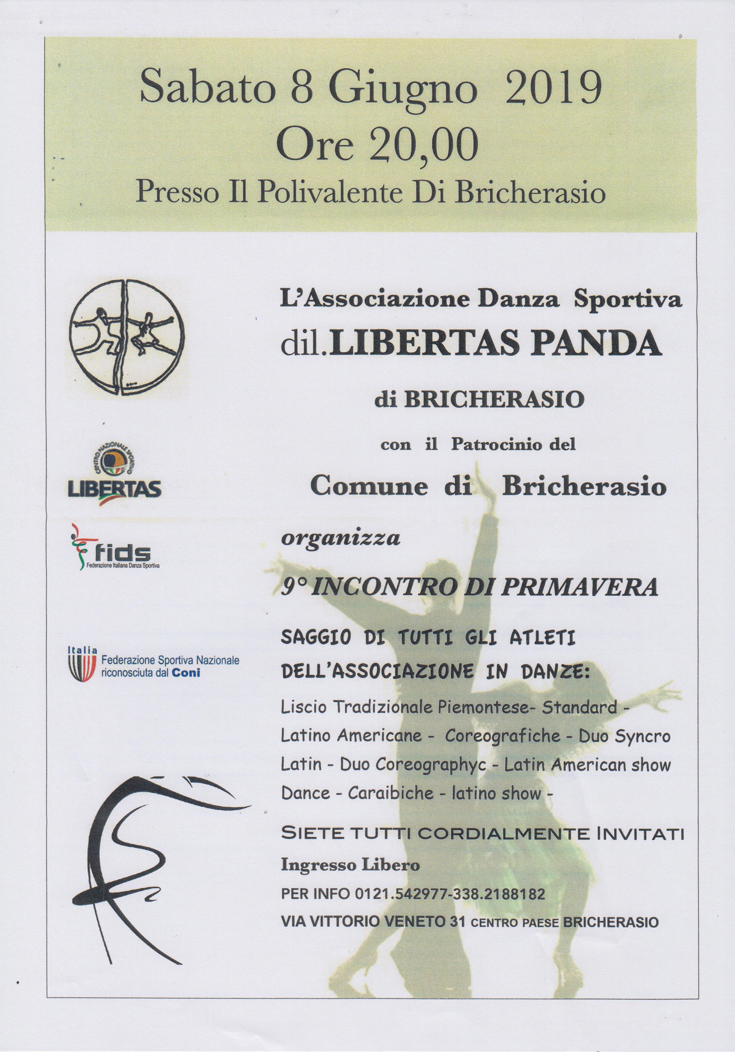 L’Associazione Danza Sportiva Dilettantistica Libertas Panda di Bricherasio con il patrocinio del Comune organizza per le ore 20 di sabato 8 giugno il 9° incontro di primavera al Salone Polivalente di Piazza Don Morero a Bricherasio. Il saggio di metà anno accademico prevede la partecipazione di tutti gli atleti del Panda che si esibiscono in danza Liscio tradizionale piemontese, Standard, danze Latino Americane, Coreografiche e Caraibiche, duo Syncro Latin, duo Coreographyc, Latin American show Dance e Latino show. La serata è ad ingresso libero. Per maggiori informazioni chiamare lo 0121/542977 oppure il 338/2188182.