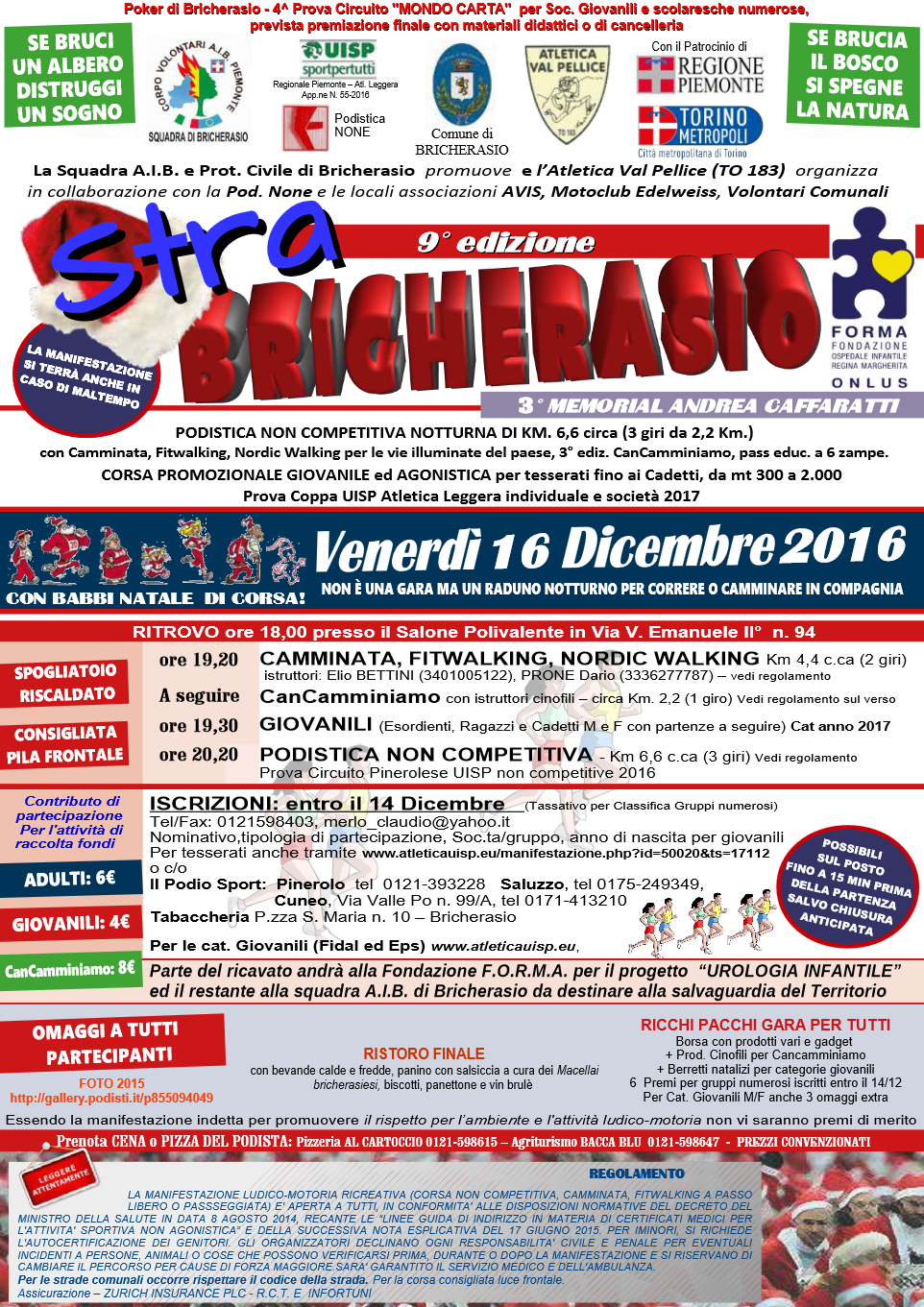 La Squadra AIB e Protezione civile di Bricherasio promuove e l’Atletica Val Pellice organizza in collaborazione con la Podistica None le locali associazioni Avis, Motoclub Edelweiss e Volontari Comunali per venerdì 16 dicembre la nona edizione della StraBricherasio, terzo memorial Andrea Caffaratti, ultima prova del poker podistico bricherasiese. La manifestazione regionale di corsa su strada giovanile è una podistica notturna con Babbo Natale, non competitiva con sezioni di Fitwalking, Nordic Walking, camminata a passo libero libera a tutti e terza edizione della Can Camminiamo, passeggiata educativa a 6 zampe per le vie illuminate di Bricherasio. La camminata con i cani è riservata ai camminatori accompagnati col proprio cane, muniti di guinzaglio e raccogli pupù ed è indispensabile un comportamento corretto pena l’allontanamento ad insindacabile giudizio di due istruttori cinofili professionisti. Il cuore pulsante della corsa lascia la suggestiva e centrale Piazza Santa Maria per trasferirsi al Salone Polivalente di Piazza Don Morero che diventa il punto di partenza ed arrivo di tutte le categorie podistiche in programma. Il maxi ristoro si tiene all’esterno dell’edificio con la novità di qualche chilo di nutella e la conferma, come da tradizione, della salsiccia alla brace. Il ritrovo per le iscrizioni è alle ore 18,00 al Salone Polivalente di Piazza Don Morero a Bricherasio, la partenza dei bambini per una mini corsa o giochi con istruttori alle ore 19,00. I camminatori e i walkers partono alle 19,20 a cui segue la passeggiata con istruttori cinofili e le giovanili alle 19,30. Alle 20,20 la podistica non competitiva di 6 km. Per iscrizioni fino a mercoledì 14 dicembre scrivere a merlo_claudio@yahoo.it o recarsi al Podio Sport in Via Bogliette, 3/C a Pinerolo segnalando nominativo, tipo di gara, società o gruppo di appartenenza ed anno di nascita per le giovanili e si può aderire sul posto fino a 15 minuti prima della partenza. Parte del ricavato andrà alla Fondazione F.O.R.M.A. per il progetto “Urologia Infantile” ed il restante alla squadra AIB di Bricherasio da destinare alla salvaguardia del territorio. Essendo la manifestazione indetta per promuovere la cultura ecologica, il rispetto per l’ambiente e l’attività ludico motoria non sono previsti premi di merito ma a tutti i partecipanti sarà consegnato un pacco gara con generi alimentari oltre al ristoro all’arrivo con bevande calde e fredde, panini con salsiccia alla brace, biscotti, panettoni e vin brulè. Dopo la gara cena o pizza del podista al Ristorante-Pizzeria “Il Pirata”, alla Pizzeria “Al Cartoccio” e l’Agriturismo “La Bacca Blu“.La manifestazione rientra nella diciottesima edizione del Natale bricherasiese.