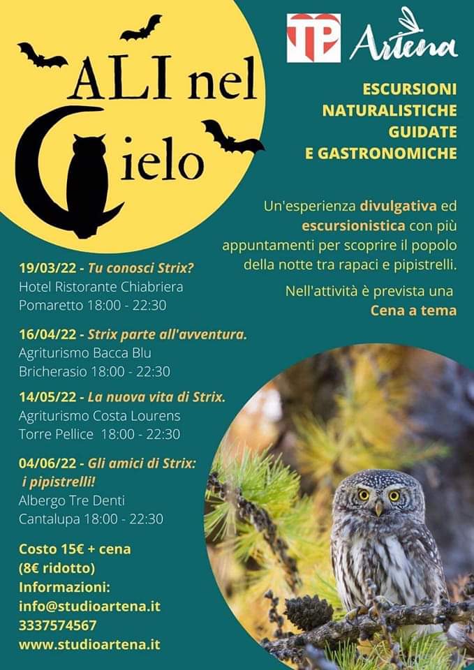 Work in progress viene da pensare quando si cita la Bacca Blu, il resort di Strada Rivà, 33 a Bricherasio. Dopo la pandemia Gabriele ha voglia di riprendere in mano la sua attività e lo fa ripartendo da un'esperienza sensazionale adatta a tutti, prevista per sabato 16 aprile dalle ore 18 alle 21 con la presentazione di Strix, un animale misterioso che vaga nella notte, la cena e l’escursione dove sono richieste scarpe comode e una pila per riuscire a conoscerlo e a scoprire le particolarità di chi come lui riesce a sfruttare la notte per vivere. L’oscurità ha sempre un qualcosa di misterioso per chi è attivo durante il giorno, un qualcosa di cui aver paura “chissà cosa nasconde la notte!” ma per Strix no, un animale della notte che come tutti i suoi compaesani ha il suo bel da fare nell’oscurità, tra lezioni di volo e faccende per i genitori è ormai diventato grande. Più passa il tempo e più cresce in lui la voglia di aggiungere un po’ di pepe alla sua vita. Se non siete ancora abbastanza curiosi di partecipare vi aggiungiamo una chicca in più. In ogni evento grazie alla collaborazione del Turismo Pinerolese e valli ci sarà anche una cena a tema proposta dai ristoratori. A marzo è tato il paese di Pomaretto ad ospitare i partecipanti, ora tocca alla Bacca Blu di Bricherasio e a maggio sarà la volta di Torre Pellice. Si finisce a giugno con i compagni di Strix, ossia i pipistrelli a Cantalupa per gli approfondimenti sui rapaci notturni con passeggiata serale. La serata a Bricherasio permetterà di capire chi è Strix e come fa a vivere la sua vita di notte. Un’esperienza adatta a grandi e piccini in parte divulgativa ed in parte escursionistica che farà passare dalla teoria alla pratica i presenti per apprendere le caratteristiche dei rapaci notturni e imparare a riconoscerli dai loro canti.L’attività sarà condotta da Arianna Rabino, guida escursionistica ambientale abilitata al costo di 15 € per gli adulti e di 8 € per i bambini fino ai 14 anni. La pagina internet da consultare per ulteriori approfondimenti è https://www.studioartena.it/attivita/tu-conosci-strix/. Per prenotazioni obbligatorie e maggiori informazioni 393/3560497 oppure scrivere a info@studioartena.it
