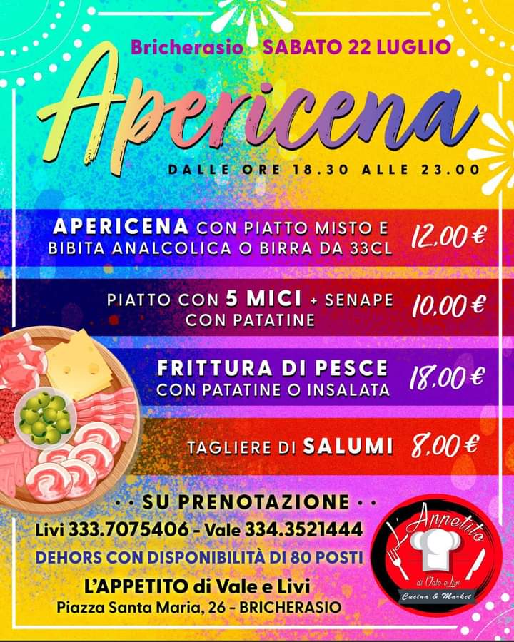 A Bricherasio la gastronomia rosticceria "L'appetito" di Vale & Livi in Piazza Santa Maria, 26 organizza per sabato 22 luglio a partire dalle ore 18,30 l’apericena in piazza con piatto misto e bibita analcolica o birra a 12 €, oppure si può mangiare la frittura di pesce con patatine o insalata spendendo 18 €, un tagliere di salumi costa 8 € e il piatto con cinque mici e senape con patatine si spendono 10 €. La serata si svolge nel dehors su prenotazione ai numeri 333/7075406 e 334/3521444.