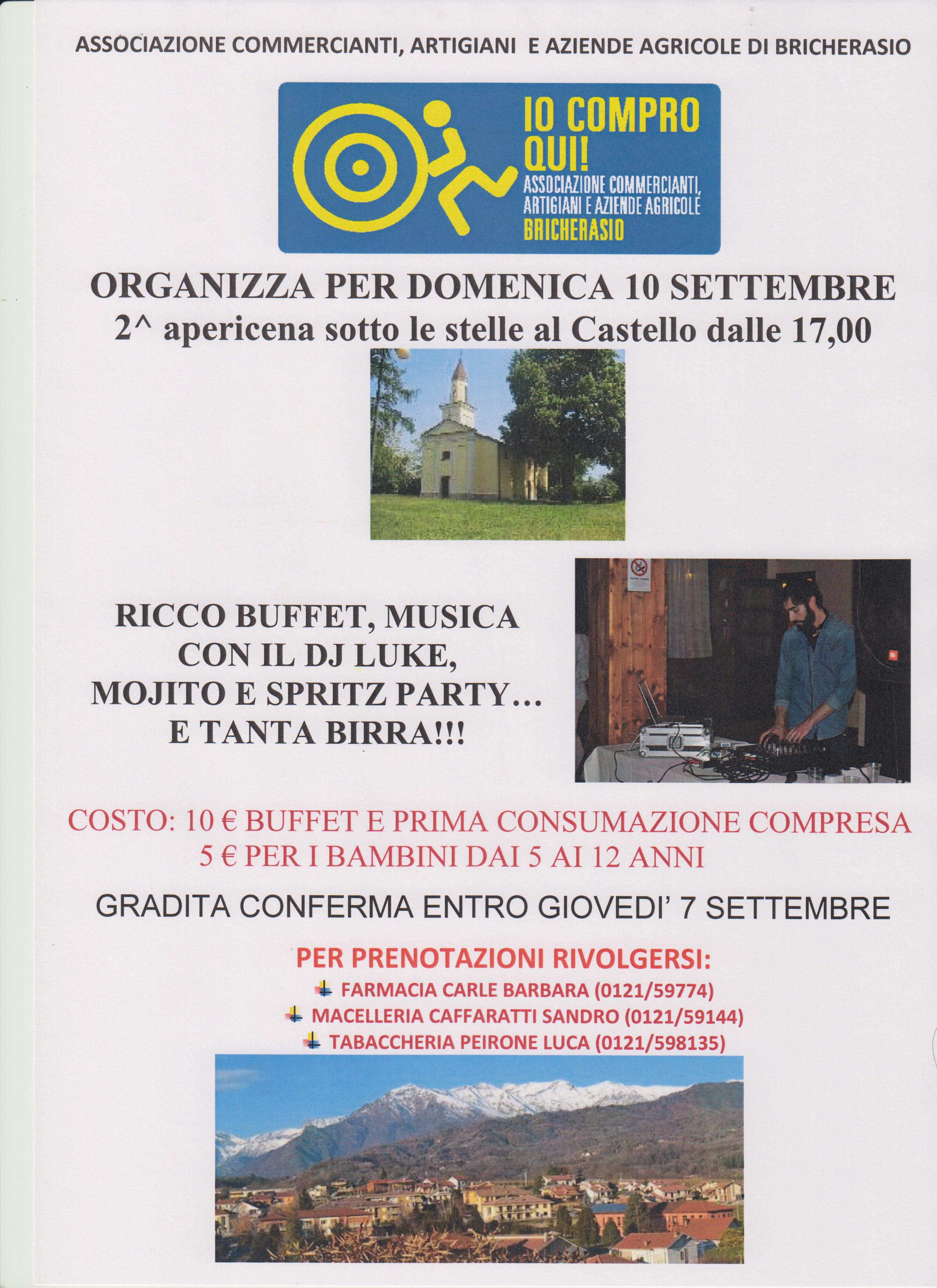 Un'apericena sotto le stelle, questo è l’evento promosso e riproposto, dopo la prima edizione del 2016, dall'Associazione Commercianti, Artigiani e Aziende Agricole di Bricherasio, inserito nel contesto della 49^ edizione della Sagra dell'Uva. La serata si terrà domenica 10 settembre alla collina del Castello, a partire dalle 17,00. Ci sarà un ricco buffet, la musica del dj Luke Barral, mojito, spritz party e tanta birra. Il costo è di 10 euro con il buffet e prima consumazione compresi, 5 euro per i bambini dai 5 ai 12 anni. Gli organizzatori invitano a confermare la partecipazione, prenotando entro giovedì 7 settembre alla Farmacia Carle Barbare (tel. 0121 59774), alla Macelleria Caffaratti Sandro (tel. 0121 59144) o alla Tabaccheria Peirone Luca (tel. 0121 598135).