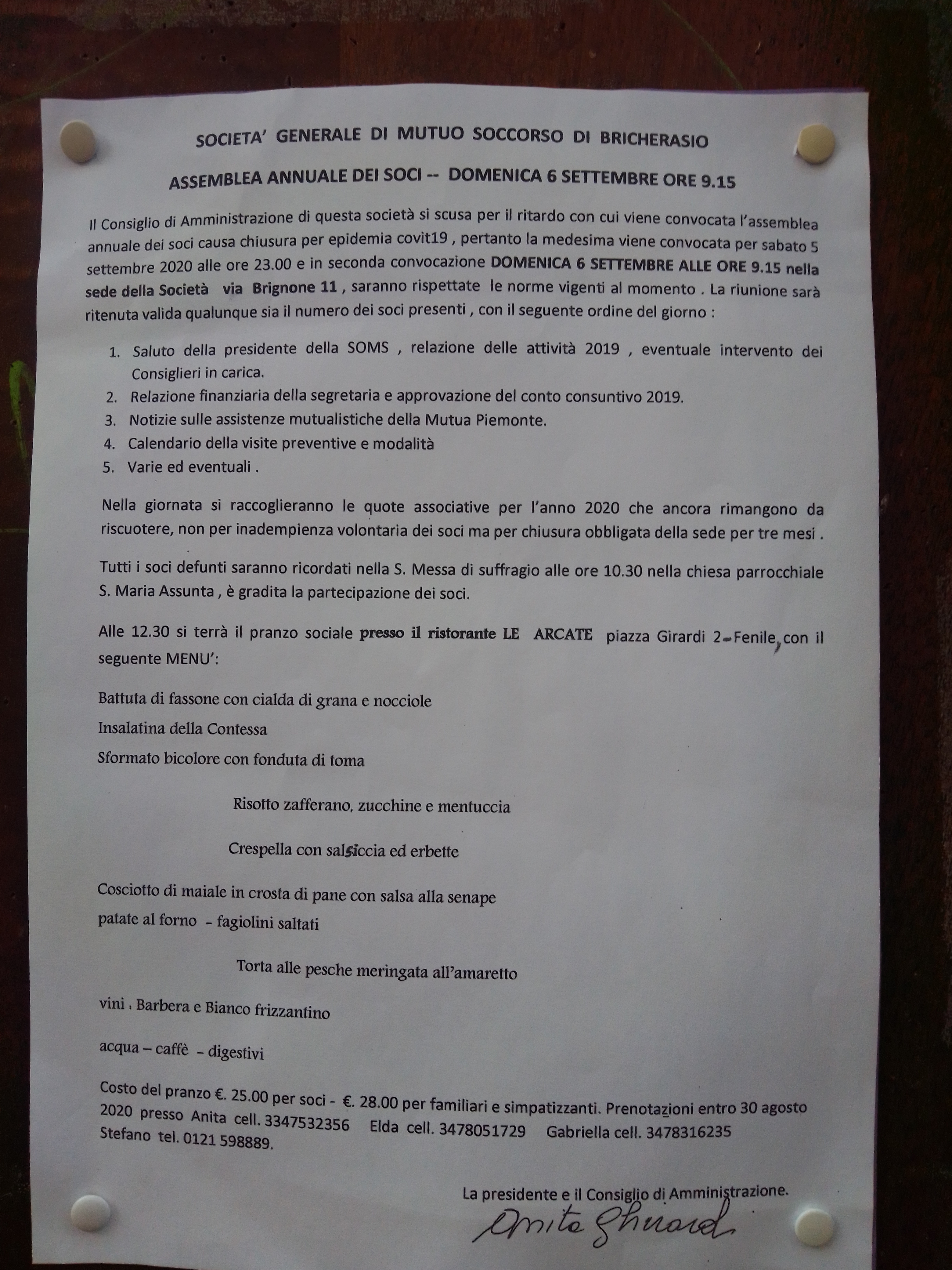 La Società di Mutuo Soccorso di Bricherasio indice per le ore 9,15 di Domenica 6 settembre nella propria sede di Via Brignone, 11 l’assemblea annuale dei soci con il rispetto delle norme vigenti per il Covid-19. All’ordine del giorno il saluto della Presidente Anita Ghirardi, la relazione finanziaria con l’approvazione del bilancio consuntivo 2019, le notizie sulle assistenze mutualistiche in corso ed il calendario delle visite preventive. Nella giornata si raccoglieranno le quote associative per l’anno 2020 che rimangono da riscuotere, rimandate per la chiusura obbligatoria della sede per tre mesi. Alle 10,30 la Santa Messa celebrata nella Parrocchia di Santa Maria a Bricherasio in suffragio dei soci defunti e alle ore 12,30 tutti i soci sono invitati al pranzo sociale al Ristorante Le Arcate di Campiglione Fenile al costo di 25 € per i soci e di 28 € per familiari e simpatizzanti. Per prenotazioni al pranzo rivolgersi oltre alla succitata Presidente al 334/7532356, a Stefano allo 0121/59889, Elda al numero 347/8051729 oppure Gabriella al numero 347/8316235 entro Domenica 30 agosto.
