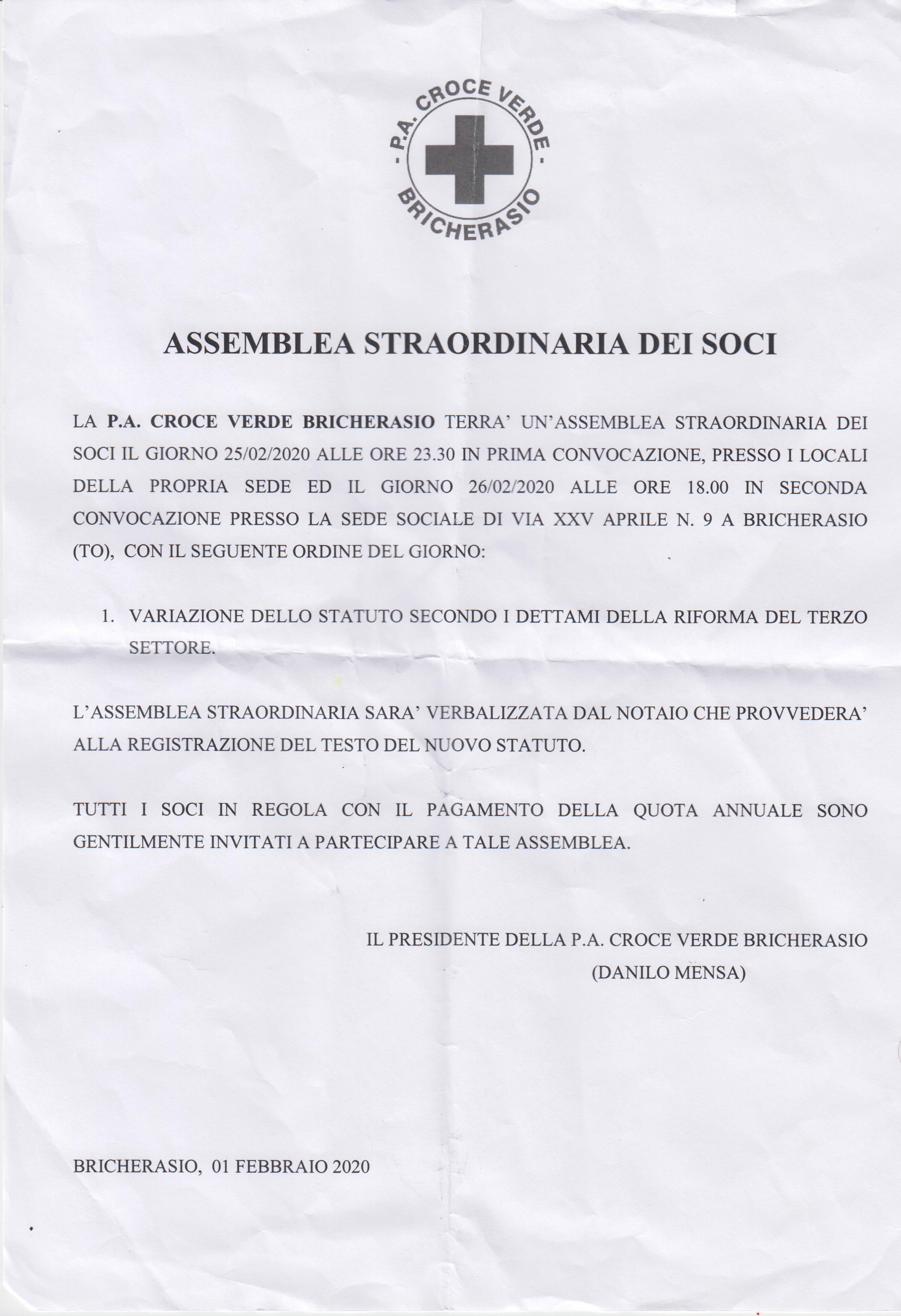 L’assemblea dei soci della Croce Verde di Bricherasio è convocata in sessione straordinaria per mercoledì 26 febbraio alle ore 18 nella sede di Via XXV Aprile 9, per discutere sulla variazione dello statuto secondo i dettami della nuova normativa del terzo settore. L’assemblea sarà verbalizzata dal notaio che provvederà alla registrazione del testo del nuovo statuto. Tutti i soci in regola con il pagamento della quota annuale sono gentilmente invitati a partecipare e per qualsiasi informazione contattare la Croce Verde di Bricherasio al numero 0121/598090.