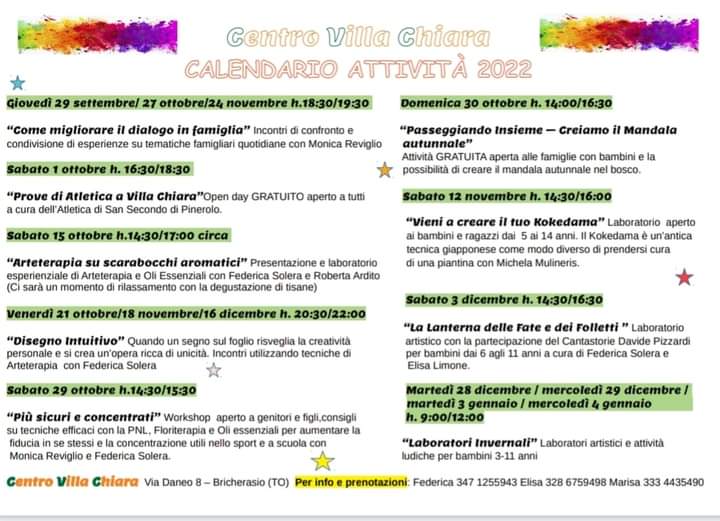 La voglia di riprendere in mano la propria vita dopo due anni di interruzione causa pandemia si percepisce a pelle parlando con le responsabili di Villa Chiara, centro per incontri, attività varie e laboratori ubicato in Via Daneo, 8 a Bricherasio. Marisa Bocco, Elisa Limone e Federica Solera sono le tre organizzatrici che hanno predisposto un calendario attività per i restanti mesi del 2022, e sono pronte a collaborare con altre associazioni per organizzare eventi e incontri. Federica, arteterapeuta, naturopata ed educatrice di prima infanzia esordisce dicendo "Tengo particolarmente a fare conoscere i benefici che si possono ottenere a livello di benessere generale attraverso l'arteterapia e la naturopatia, tenendo conto di una visione olistica". Precisa che "Attraverso i laboratori esperienziali artistici-espressivi che vengono proposti, si crea uno spazio per poter esprimersi liberamente ed in modo spontaneo attraverso le emozioni, confrontarsi con se stessi e con gli altri dove le opere finali non mirano ad un valore estetico, ma l'attenzione è rivolta a riscoprire la propria identità con l' unicità e la bellezza che ognuno possiede". Sabato 12 novembre dalle ore 14 entra in scena Michela Mulineris con il laboratorio artistico “Vieni a Creare il tuo kokedama” per ragazzi dai 5 ai 14 anni che riscoprono l’antica tecnica giapponese per prendersi cura delle piantine. Giovedì 24 alle 18,30 terzo e ultimo incontro di confronto e condivisione di esperienze su tematiche quotidiane dal titolo “Come migliorare il dialogo in famiglia” condotto da Monica Reviglio. Sabato 3 dicembre altro laboratorio che riguarda “La lanterna delle fate e dei folletti” con la partecipazione del cantastorie Davide Pizzardi per ragazzi dai 6 agli 11 anni a cura di Federica Solera e Elsa Limone on ritrovo alle 14,30. La Solera presenzia anche le due serate sul Disegno intuitivo di venerdì 18 novembre e di venerdì 16 dicembre utilizzando tecniche di arteterapia. Interviene Elisa Limone che ribadisce "Dopo la pandemia abbiamo bisogno di riprendere fiducia in noi stessi e nelle nostre capacità attraverso la socializzazione. Le attività proposte e le occasioni di incontro vanno in questa direzione, l’unione fa la forza. Per novembre e dicembre abbiamo in programma laboratori manuali e artistico-creativi per i bambini e abbiamo intenzione di riproporre i laboratori manuali con la creta a partire dal 2023. Per il futuro si vedrà di coinvolgere le scuole medie nelle nostre attività”. Conclude Marisa Bocco, colei che lavorando dietro le quinte si occupa degli aspetti burocratici e organizzativi, che afferma “Le nostre proposte, le attività e le tecniche utilizzate mirano a promuovere e favorire esperienze di benessere e di cura di sé, attraverso modalità espressivo-comunicative verbali e non, attraverso condivisione e reciproco confronto nel rispetto di sé, dell’altro e dell’ambiente a cui apparteniamo”.