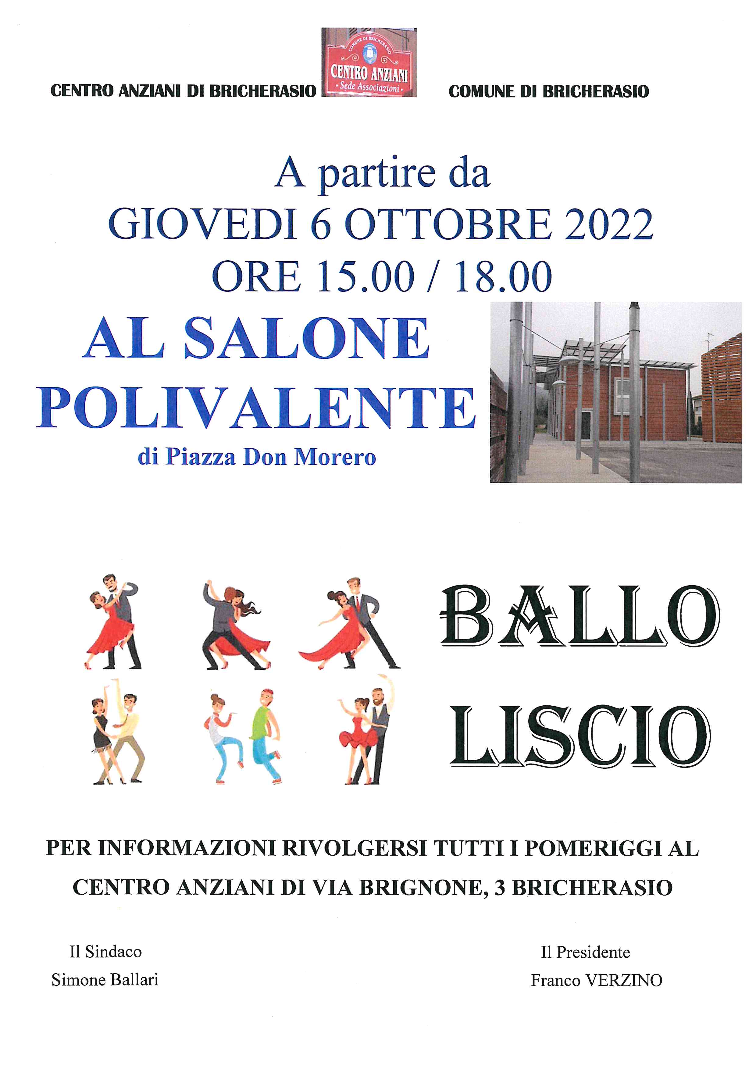 Il Centro Anziani di Bricherasio in collaborazione con il Comune offre la possibilità di ballare il liscio al salone polivalente di Piazza Don Morero tutti i giovedì a partire dalle 15,00 con inizio giovedì 6 ottobre. Per informazioni rivolgersi, tutti i pomeriggi, dalle ore 15.00 alle 18.00, presso il Centro Anziani di Via Brignone, 3 a Bricherasio.
