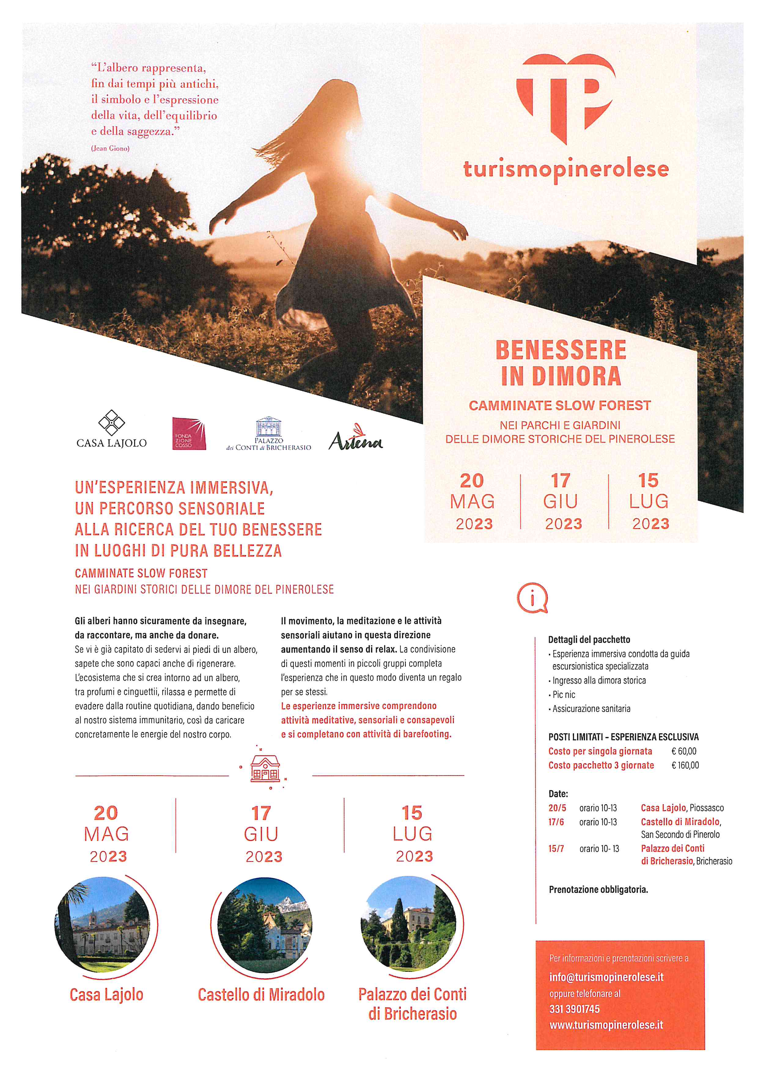 Il palazzo dei Conti di Bricherasio (Via Vittorio Emanuele II, 7) ospiterà sabato 15 luglio, dalle ore 10 alle 13, una camminata Slow forest nei parchi e giardini delle dimore storiche del pinerolese, un'esperienza immersiva, un percorso sensoriale alla ricerca del proprio benessere in luoghi di pura bellezza. L'esperienza sarà condotta da guida escursionistica specializzata; ingresso alla dimora storica e pic nic con posti limitati al costo di 60 €. Per prenotazioni obbligatorie scrivere a info@turismopinerolese.it oppure telefonare al numero 331/3901745 . Maggiori informazioni sul sito www.turismopinerolese.it