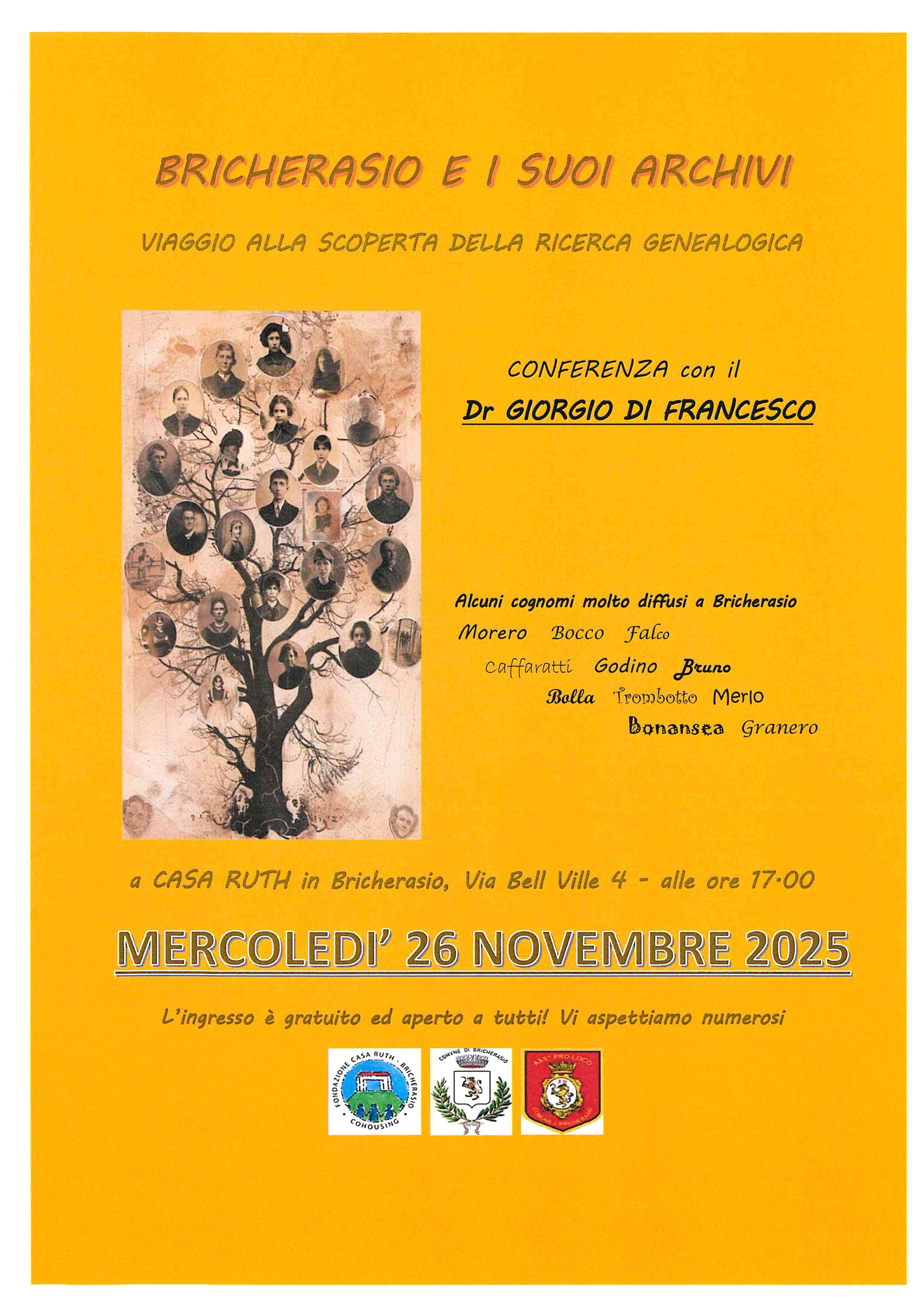 Il terzo ed ultimo appuntamento del trittico di conferenze organizzate presso il cohousing "Fondazione Casa Ruth", in Via Bell Ville, 4 a Bricherasio, è in programma per mercoledì 26 novembre a partire dalle ore 17. Il Dottor Giorgio Di Francesco conduce l’incontro, patrocinato dal Comune, ad ingresso libero ed aperto a tutti, su “Bricherasio e i suoi archivi” riguardante alcuni cognomi molto diffusi nel paese (come Bolla, Bonansea, Granero e Trombotto...).