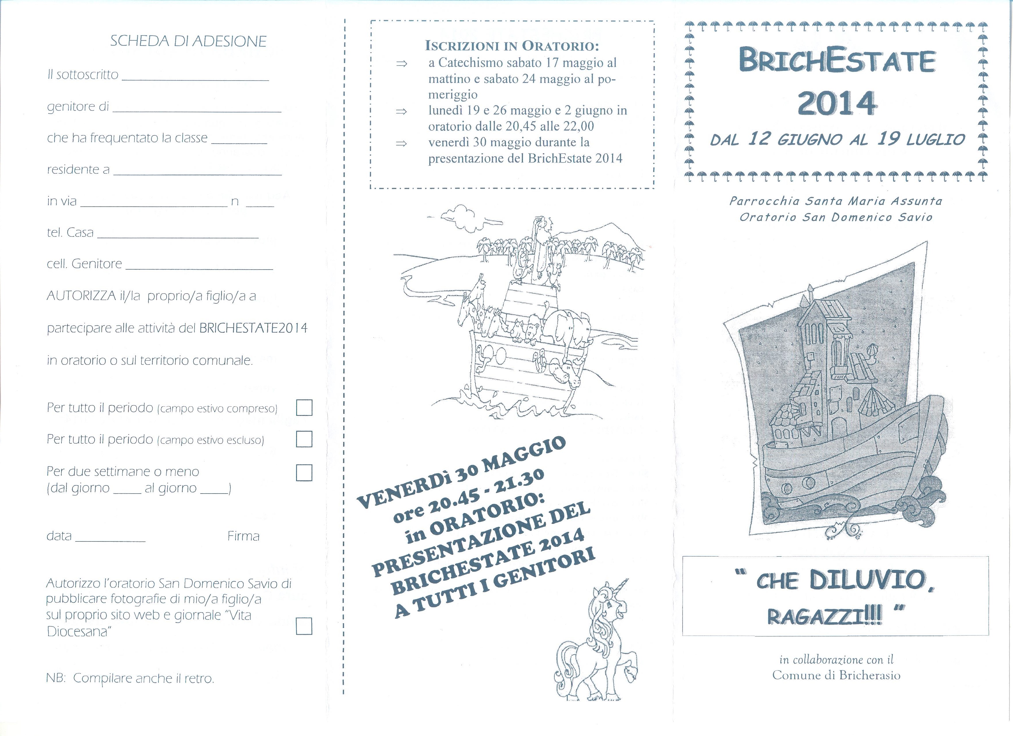 La Parrocchia di Santa Maria e l’Oratorio San Domenico Savio di Bricherasio, in collaborazione con il Comune, presentano “Brichestate 2014” con la tradizione di 16 edizioni consecutive. Brichestate impegna i partecipanti da giovedì 12 giugno a venerdì 18 luglio con festa finale all’Oratorio sabato 19 luglio. Gli orari sono da lunedì a venerdì dalle ore 9.00 alle 17.30 per chi usufruisce del servizio mensa presso l’oratorio e dalle ore 9.00 alle 12.00 e dalle 14.30 alle 17.30 per chi torna a casa per il pranzo. L’attività si svolge presso i campi e i locali dell’oratorio S. Domenico Savio di Via del Portone e il filo conduttore dell’Estate Ragazzi è “Che diluvio ragazzi!!!”, accompagnati da Sem il giovane protagonista della storia e discendente di Noè, e da Cruà uno strano corvo parlante e si seguirà la spedizione del papà di Sem, l’archeologo Pietro Scavatori che farà da contorno all’incredibile mese di Brichestate. Sono previsti ogni giorno tornei sportivi (calcio, pallavolo, tennistavolo e calciobalilla), attività teatrali, di danza e di laboratorio manuale e sportivo, gioco libero e a squadre, ogni settimana una fantastica gita e le incredibili Olimpiadi degli Oratori. Sarà possibile usufruire del servizio della mensa scolastica con l’assistenza e il servizio da parte degli animatori. Viene richiesto un contributo spese che varia dagli 80 € per coloro che partecipano sia a Brichestate che al campo estivo di Cà Nostra agli inizi di luglio, ai 50 euro per il solo campo estivo e per l’intero mese di attività di Brichestate e 15 € di sconto-Famiglia per i fratelli dal 2° in poi: Agevolazioni anche per chi sarà presente due settimane o meno: 30 € ma si sottolinea che il costo di iscrizione non deveessere da impedimento ad alcuno. Per qualsiasi delucidazione rivolgersi ai responsabili ovvero Davide 340-5766020 oppure Laura 347-9862348 mail: lauraclemente91@gmail.com e ulteriori informazioni anche sul sito web www.oratoriosandomenicosavio.it