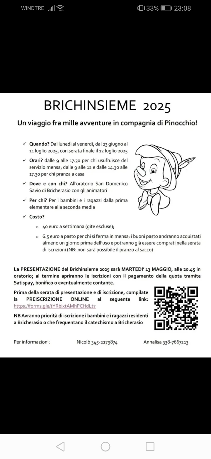 Il Brichinsieme 2025 è pronto a partire. Lunedì 23 giugno riaprono i battenti dell'oratorio San Domenico Savio, in Via Del Portone, 6 a Bricherasio per tre settimane di puro divertimento. Quest’anno il viaggio tra mille avventure sarà in compagnia di Pinocchio e impegna i partecipanti fino all’11 luglio con serata finale al Salone Polivalente di Piazza Don Morero prevista sabato 12 luglio L’Estate Ragazzi si svolge dalle ore 9 alle 17,30 per chi usufruisce del servizio mensa e dalle 9 alle 12 e dalle 14,30 alle 17,30 per coloro che pranzano a casa ed è rivolto a bambini e ragazzi dalla prima elementare alla seconda media. Per partecipare al Brichinsieme 2025 è necessario preiscriversi attraverso il modulo reperibile sul link https://forms.gle/tYRbixtAMhPCHdLt7 e serve per sapere a quali tornei sportivi si desidera prendere parte. Il costo di partecipazione è di 40 € a settimana oltre ai buoni pasto che devono essere acquistati almeno il giorno antecedente al prezzo di € 6,50 cadauno e si ricorda che non sarà possibile portarsi il pranzo da casa