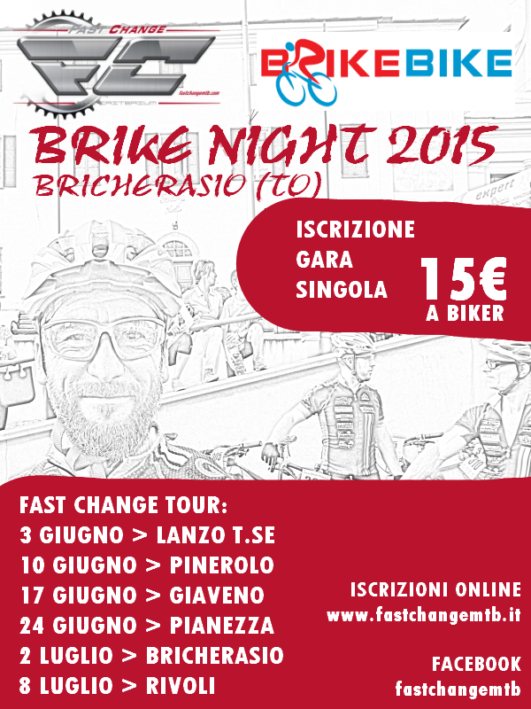 La Società Ciclistica Brike Bike di Bricherasio con il patrocinio dell’Assessorato allo Sport del Comune di Bricherasio organizza per giovedì 2 luglio la quarta edizione della “Brike night”, corsa serale in mountain bike, aperto a 100 coppie o, per i primi 50 iscritti, in solitaria su di un circuito semi-cittadino di 2,5 km, con il mitico passaggio nella pista bmx di Via Bellville. La gara fa parte di un circuito di gare preserali organizzate da Fast Change dove passione, esperienza e competenza da sempre distinguono l’Associazione incontrando altre realtà altrettanto attive e volenterose del nostro meraviglioso territorio nasce il mtb contest camp un vero e proprio "motore" di eventi sportivi con il compito di organizzare gare inconfondibili come il "mitico" Fast Change, espandendolo in altre competizioni legate al mondo della MTB, sia regionali che a livello nazionale. Ritrovo dalle ore 18,30 in Piazza Santa Maria e dopo il briefing delle 20 la partenza fissata alle 20,30 a cui seguirà la premiazione e ristoro finale per gli atleti. Alla gara sono ammessi tutti i tesserati F.C.I. e tutte le categorie esclusi i giovanissimi. Alla gara sono ammessi tutti i tesserati F.C.I. ed Enti della Consulta. Si ricorda che possono partecipare alla notturna anche gli atleti non tesserati che, presentandosi con certificato medico agonistico. Le adesioni si ricevono tramite bonifico bancario sull’IBAN: IT72U0848730751000310100275 della Banca di Cherasco, Agenzia di Pinerolo con causale del versamento: Brike Night 2014 e indicando cognome e nome. Ci si può iscrivere il giorno della gara dalle 18 alle 19,30, e si suggerisce l’uso di una luce anteriore, con tanto buon senso, ed è obbligatorio l’uso del casco. Per iscriversi online utilizzare il sito www.fastchangemtb.it e per maggiori informazioni e su facebook cercare fastchangemtb su o telefonando a Maurizio al numero 333/6465624.