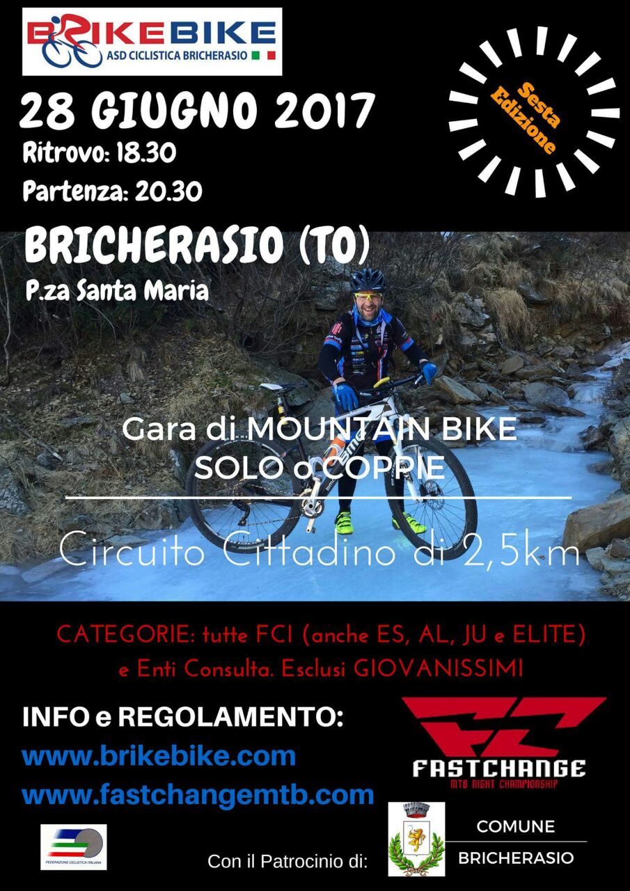 La Società Ciclistica Brike Bike di Bricherasio con il patrocinio dell’Assessorato allo Sport del Comune di Bricherasio organizza per mercoledì 28 giugno la sesta edizione della “Brike night”, corsa serale in mountain bike, aperta a 100 coppie oppure in solitaria. “Come sempre il team Brike Bike si pone l’obbiettivo di far conoscere il mondo della bicicletta in tutti i suoi aspetti, dalla formazione al cicloturismo, dallo svago all’agonismo”, esordisce così il tesoriere dell’Associazione bricherasiese Maurizio Cavallero. La gara fa parte di un circuito di cinque gare preserali organizzate da Fast Change dove passione, esperienza e competenza, che da sempre distinguono il Brike Bike. Incontrando altre realtà altrettanto attive e volenterose del nostro meraviglioso territorio nasce il mtb contest camp un vero e proprio motore di eventi sportivi con il compito di organizzare gare inconfondibili come il Fast Change, espandendolo in altre competizioni legate al mondo della MTB, sia regionali che a livello nazionale. Ritrovo dalle ore 18,30 in Piazza Santa Maria e dopo il briefing delle 20 la partenza fissata alle 20,30 a cui seguirà la premiazione e ristoro finale per gli atleti. Alla gara sono ammessi tutti i tesserati F.C.I., tutte le categorie dagli esordienti agli juniores, esclusi i giovanissimi, tutti i tesserati F.C.I. ed Enti della Consulta. Si ricorda che possono partecipare alla notturna anche gli atleti non tesserati che, si presentano con certificato medico agonistico. Ancora il tesoriere “Brike Night è una formula ormai consolidata di evento mountain bike, da svolgersi a coppie in staffetta, oppure da soli ed è una manifestazione che porta la MTB nel centro dei paesi e permette di far vivere a tutti questo magnifico sport”. Partenza, arrivo e tutta la logistica hanno luogo in Piazza Santa Maria. Si sviluppa su un percorso semi-cittadino di circa 2,5 km misto asfalto, ciottolato e sterrato, con brevi salite e discese molto divertenti e con il passaggio nella pista bmx di Via Bellville. Conclude Cavallero “Nell’arco di un’ora si svolge tutto. Si parte a piedi in stile Le Mans. Inforcata la MTB si dà tutto nell’arco di un giro, per poi dare il cambio al compagno di team. I Solitari (solo) devono invece dosare le energie perché il cambio ogni giro lo danno a se stessi”. Informazioni e regolamento sui siti www.brikebike.com e www.fasychangemtb@com.