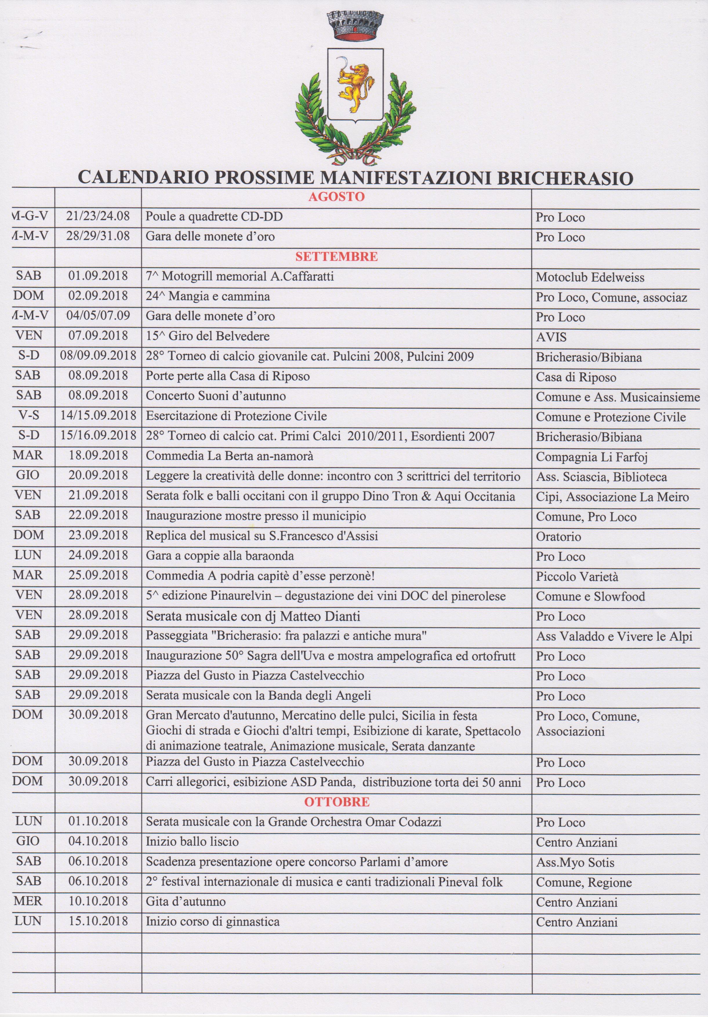 Calendario aggiornato delle manifestazioni promosse nei mesi a venire dal Comune e dalle numerose associazioni locali sul territorio di Bricherasio.