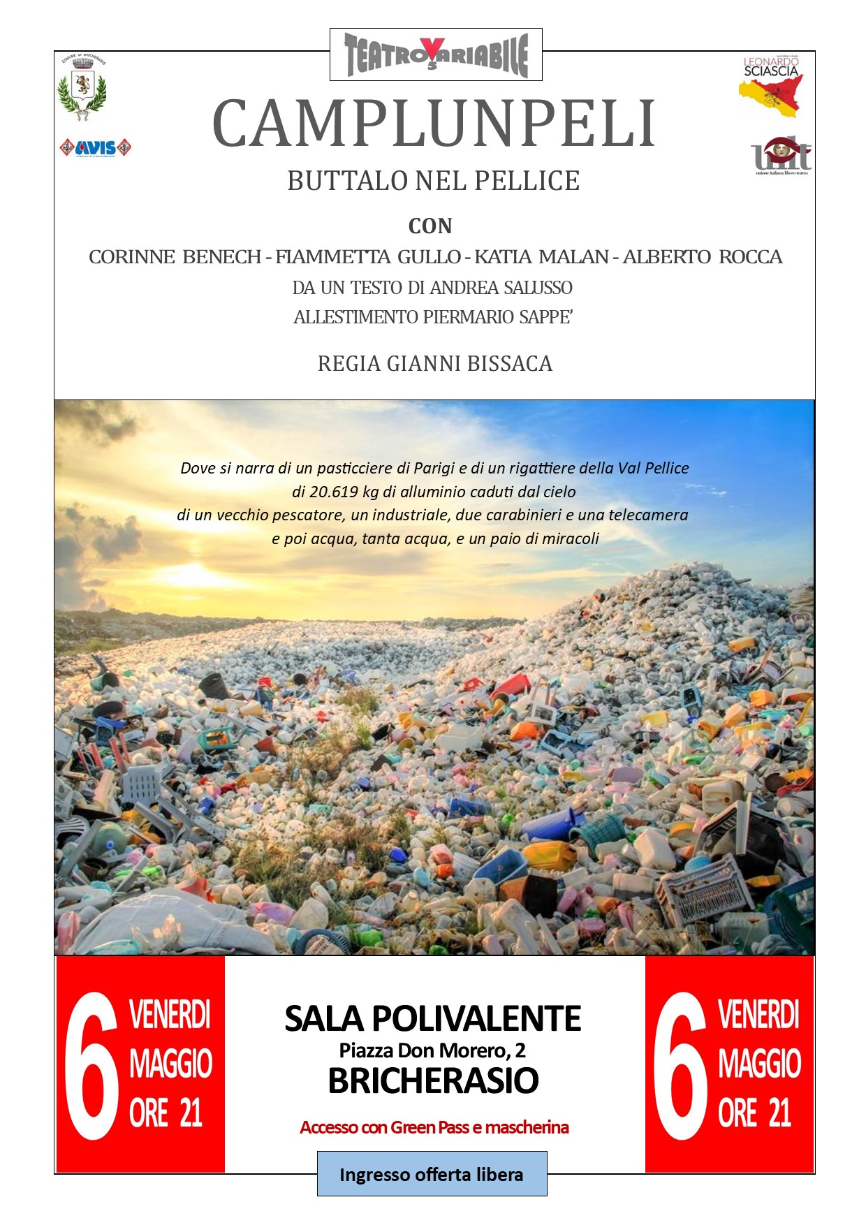 Le Associazioni Culturali “Leonardo Sciascia” di Bricherasio", l’Avis e il Comune di Bricherasio presentano per venerdì 6 maggio alle ore 21 a Bricherasio al Salone Polivalente in Piazza Don Morero, 4 lo spettacolo teatrale "Camplunpeli : buttalo nel Pellice" del Teatro Variabile 5 con la regia di Gianni Bissaca. Lo spettacolo narra le sorti del nostro torrente tra rifiuti, personaggi veri e inventati e l'acqua, tanta acqua e un paio di miracoli dove un pasticciere di Parigi e un rigattiere della Val Pellice, di un vecchio pescatore, di un industriale, due carabinieri e una telecamera e di oltre 20.000 kg di alluminio caduti dal cielo. Ingresso a offerta libera e accesso con green pass e mascherina.