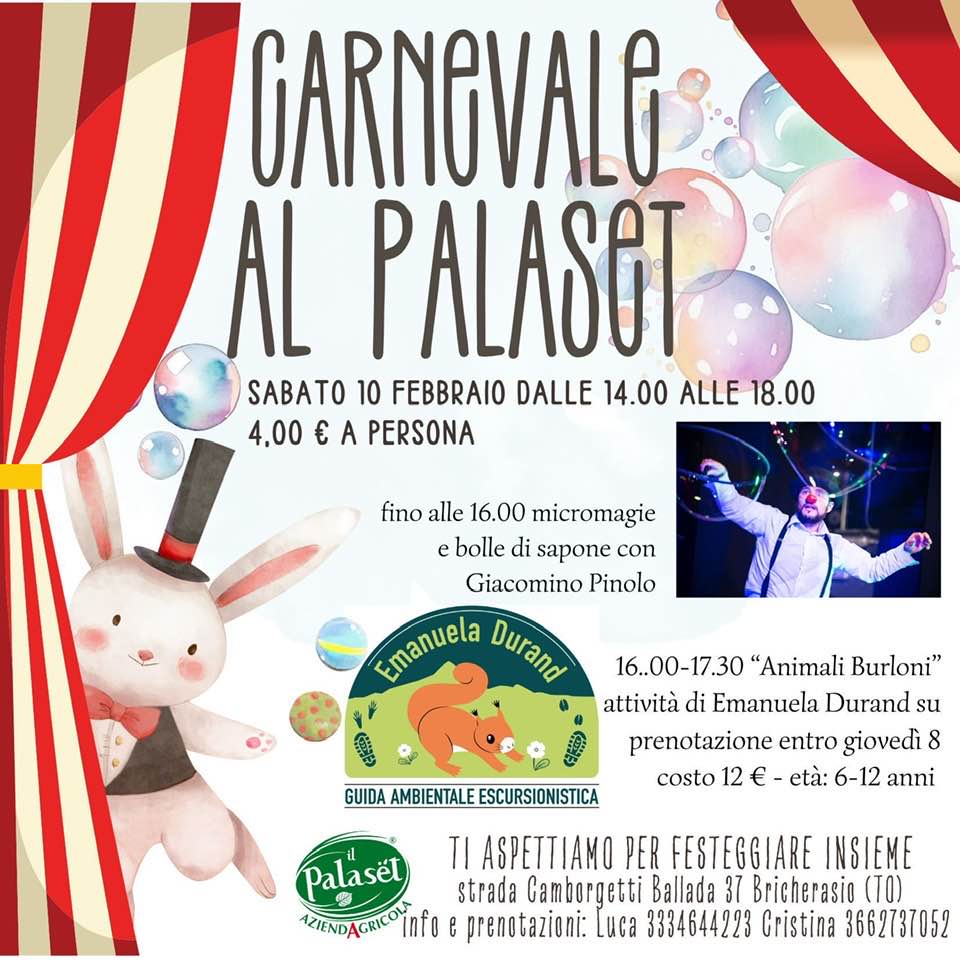 L'azienda agricola Il Palaset di Luca Bonansea di Strada Camborgetti Ballada, 37 a Bricherasio organizza per sabato 10 febbraio il “Carnevale al Palaset”, per trascorrere un pomeriggio festeggiando insieme il carnevale dalle ore 14 alle 18 al costo di 4 euro a persona. Si inizia con le micromagie e bolle di sapone con Giacomino Pinolo e si prosegue alle 16 con il Carnevale degli “Animali burloni”, attività curata dalla guida ambientale ed escursionistica Emanuela Durand che spiega come gli animali si nascondono oppure scelgono di farsi notare nel paesaggio con giochi e attività alla scoperta delle più ingegnose “maschere” naturali e per far festa si proverà ad imitarli trasformando i giovani partecipanti in bravissimi attori. L’attività si svolge su prenotazione entro giovedì 8 al costo di 12 € e riservata ai ragazzi dai 6 ai 12 anni. Per la prelazione si chiede di specificare la partecipazione all’attività con Emanuela Durand o meno e sarà comunque gradito conoscere il numero dei bimbi e la loro età. Per informazioni e prenotazioni rivolgersi a Luca al numero 333/4644223 oppure Cristina al 366/2737052.